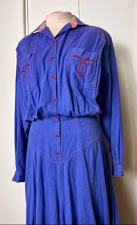 Vintage 1980's "Temtex" Blue and Red Blouson Western-Style Dress