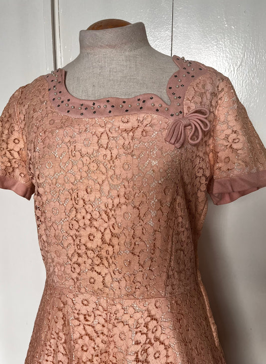Vintage 1950's Salmon-Pink Lace and Sequin Embellished Fit n Flare Dress