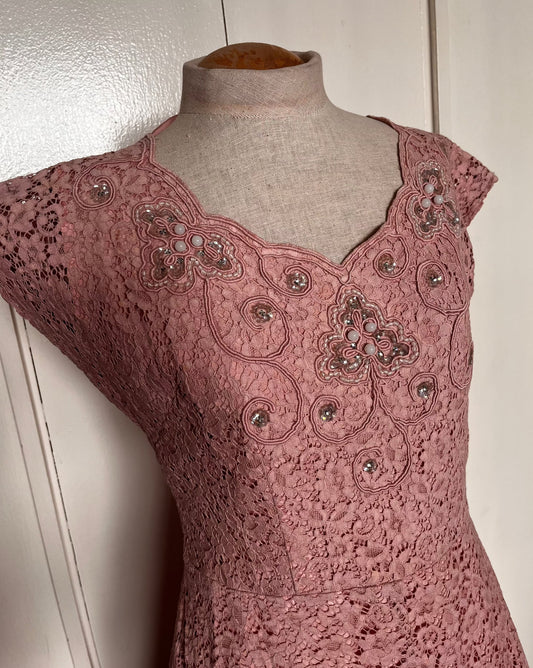 Vintage 1950's Pink Lace and Sequin Embellished Fit n Flare Dress
