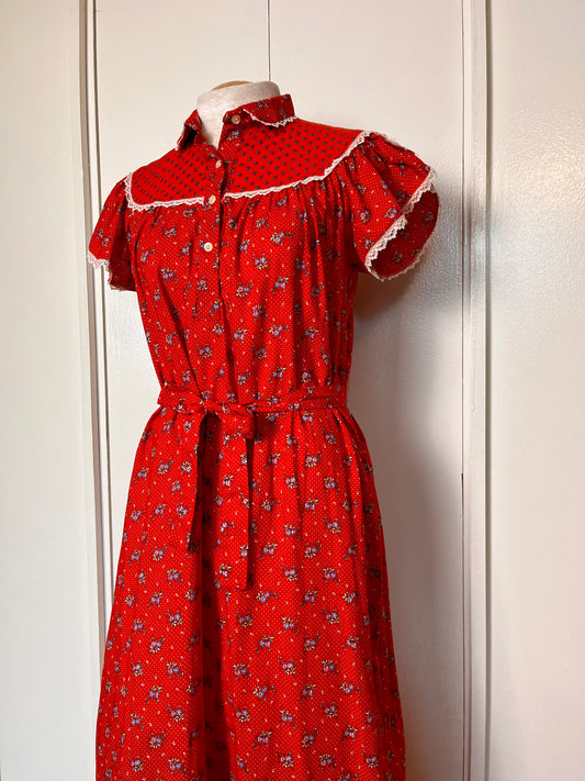 Vintage 1970's "Eber of San Francisco" Red Calico Flutter Sleeve Midi Dress with Belt