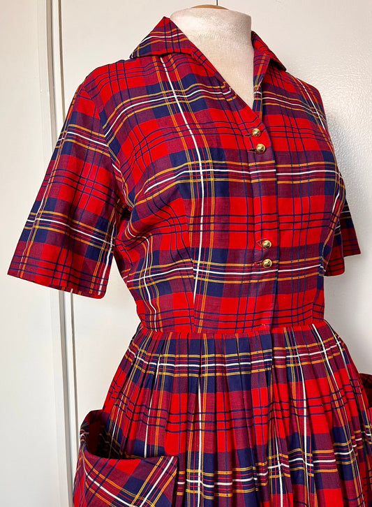 Vintage 1950's Shirtwaist Dress in Red Cotton Plaid with Gold Buttons and Saddlebag Pockets