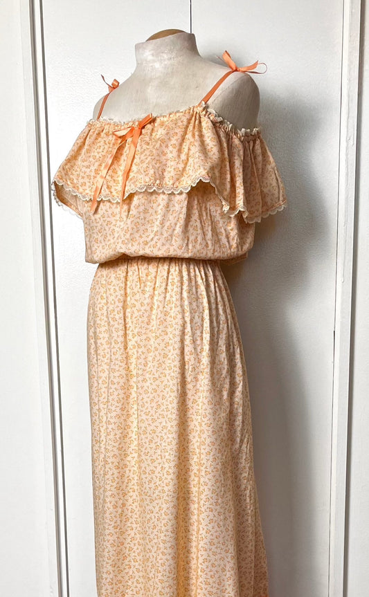 Vintage 1970's Sherbet-Orange Calico Floral Maxi Prairie Dress