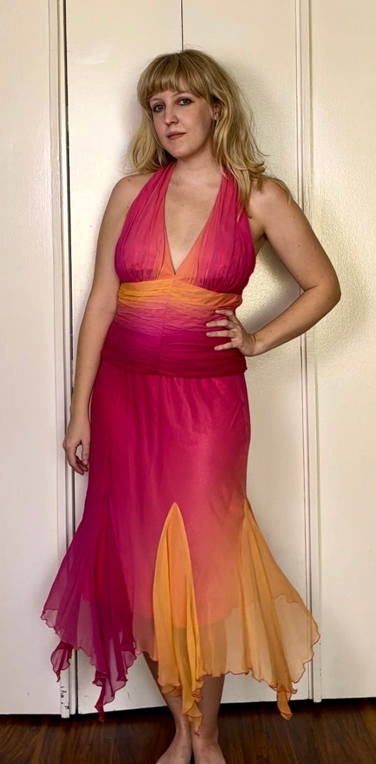 Vintage Y2K "Cache" Pink & Orange Ombre/Gradient Two-Piece Top & Skirt Set