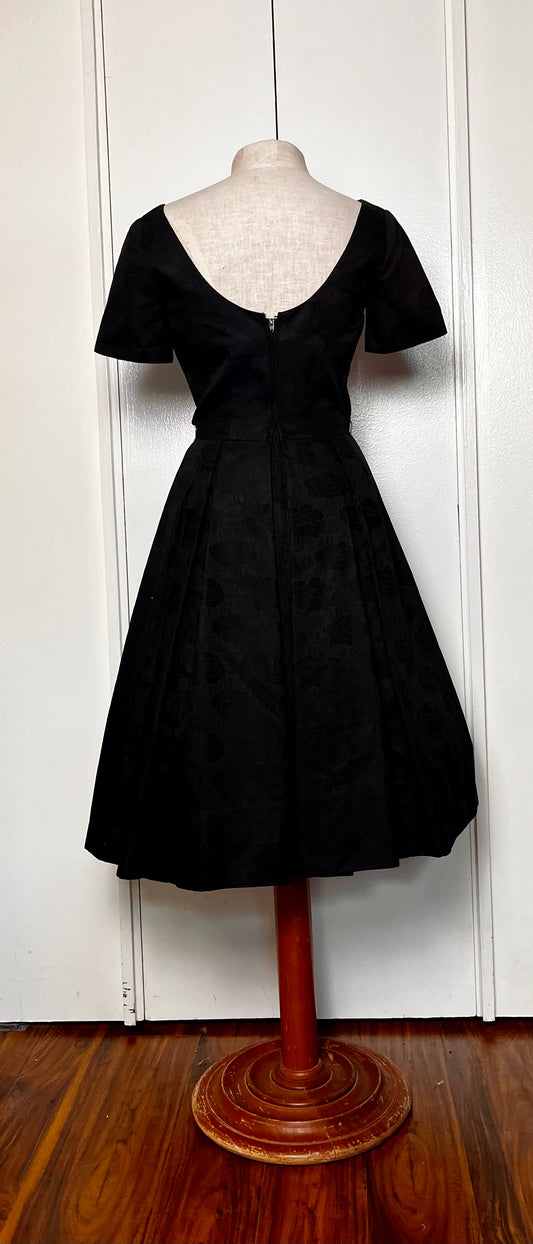 Vintage 1950's Black Embossed Rose Cotton Fit N Flare Dress