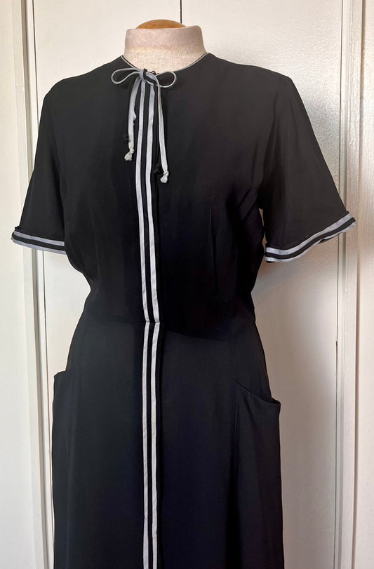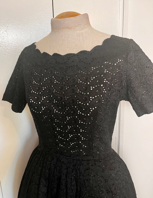 Vintage 1950's Black Cotton Eyelet Scalloped Fit n Flare Dress