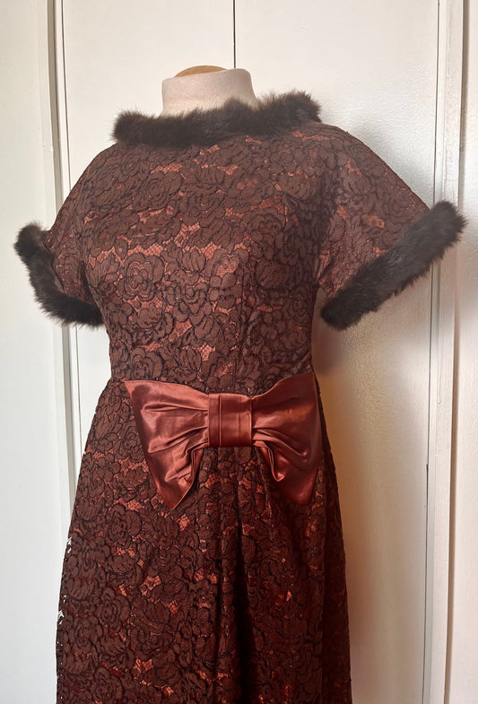 Vintage 1950's Brown Satin and Lace with Fur-Trim Sheath Dress