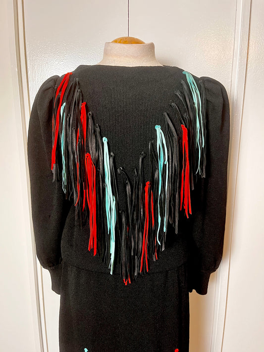 Vintage 1980s "Lillie Rubin" Leather-Fringe Sweater Dress