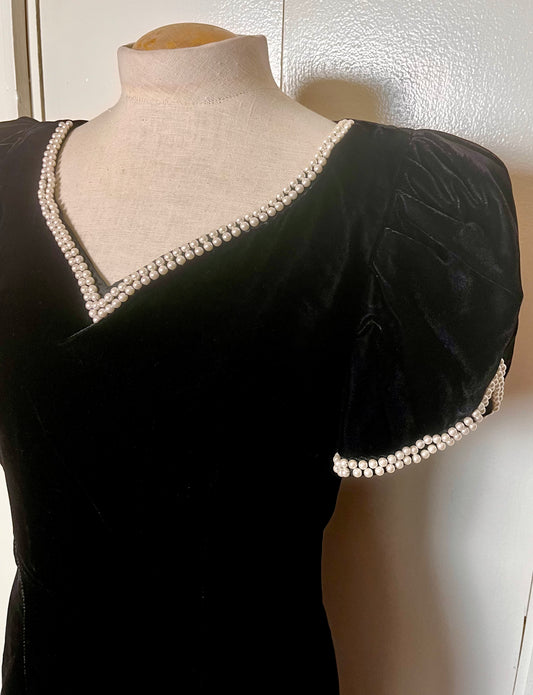 Vintage 1980's "Lisa Michaels" Black Velvet & Pearl Puff Sleeve Dress