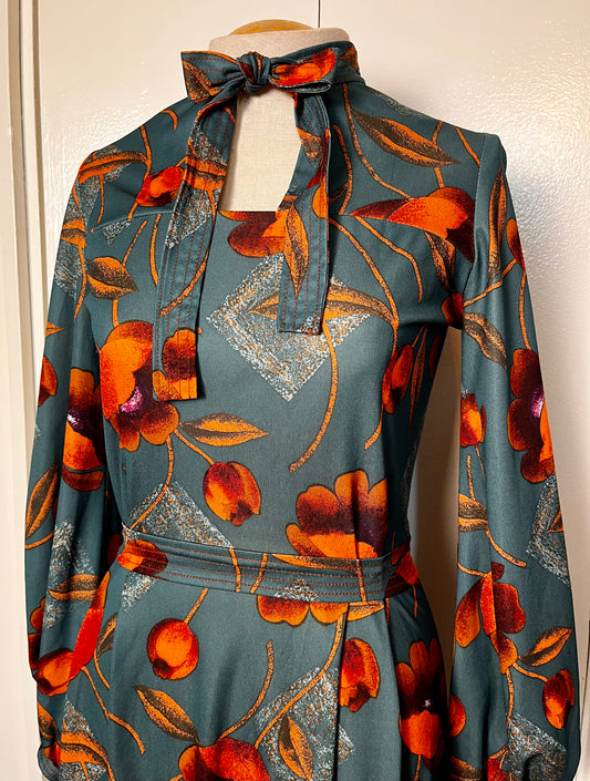 Vintage 1970's Wild Poppy-Print Orange & Teal Tie-Neck Balloon Sleeve A-Line Maxi Dress