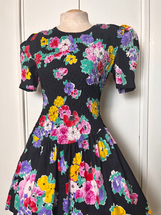 Vintage 1980's "Disorderly Conduct" Rainbow Floral Black Mini Dress