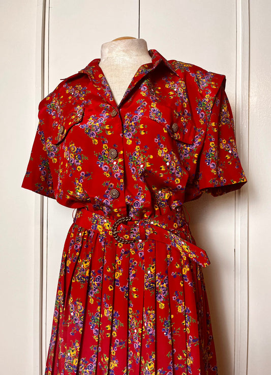 Vintage 1980's does 40's "Leslie Fay" Red Floral Button-up Dress