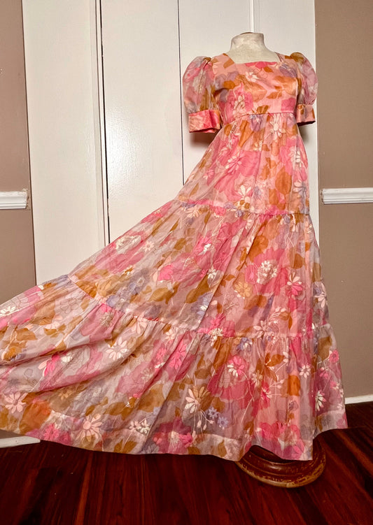 Vintage 1970's "Home-Sewn" Pink Flower Chiffon Maxi Dress