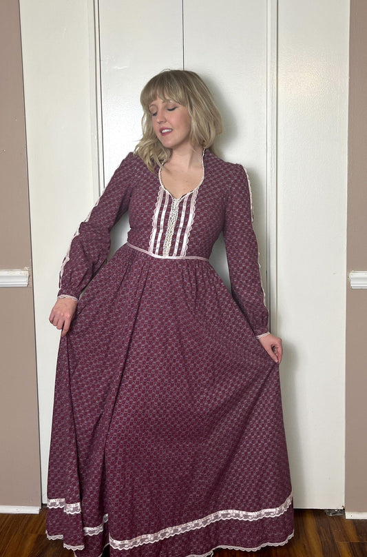 Vintage 1970's "Gunne Sax by Jessica McClintock" Burgundy-Red Long Sleeve Maxi Dress