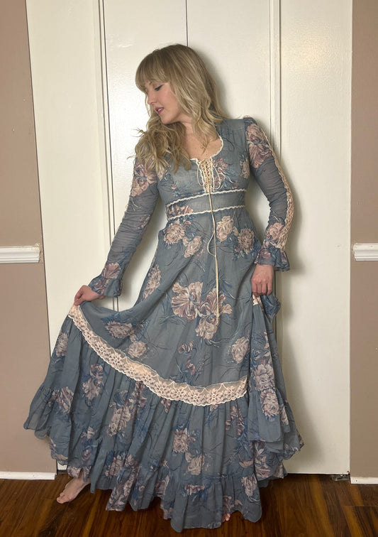 Vintage 1970's "Gunne Sax by Jessica McClintock" Blue Floral Long Sleeve Maxi Dress
