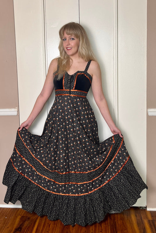 Vintage 1970's "Gunne Sax by Jessica McClintock" Black (Poppy Print) Maxi Dress