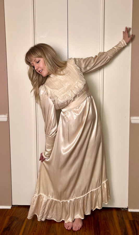 Vintage 1970's "Gunne Sax by Jessica McClintock" Ivory Satin & Lace Maxi Dress