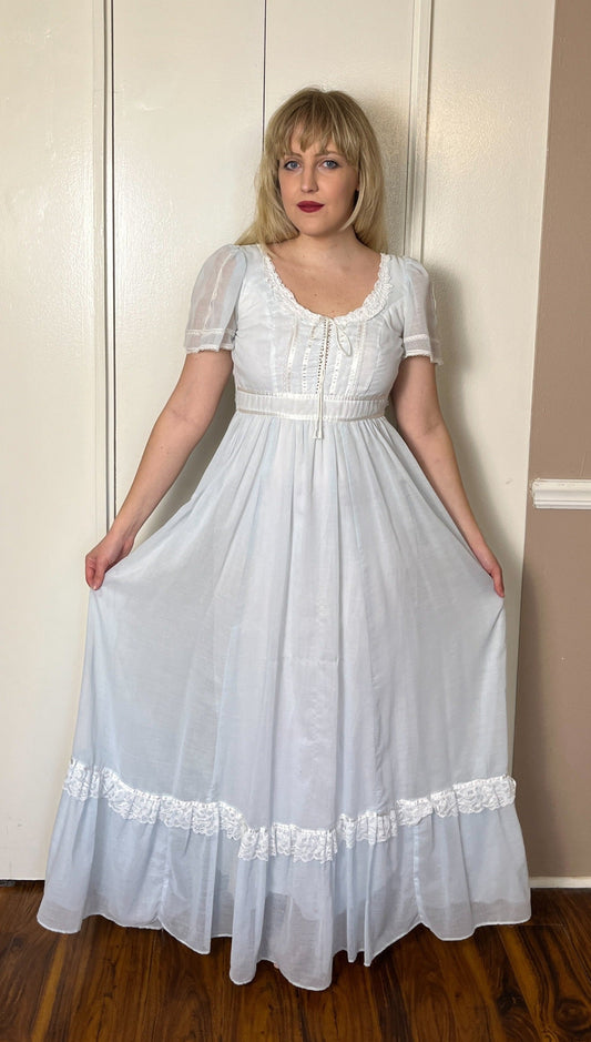 Vintage 1970's "Gunne Sax by Jessica McClintock" Light Blue Flutter Sleeve Maxi Dress