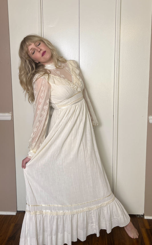 Vintage 1970's "Gunne Sax by Jessica McClintock" Off-White Cotton-Gauze Maxi Dress