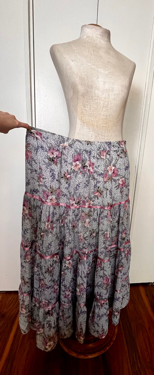 Vintage 1970's Home-Sewn Purple Floral & Lilac Ribbon Prairie-Style Skirt