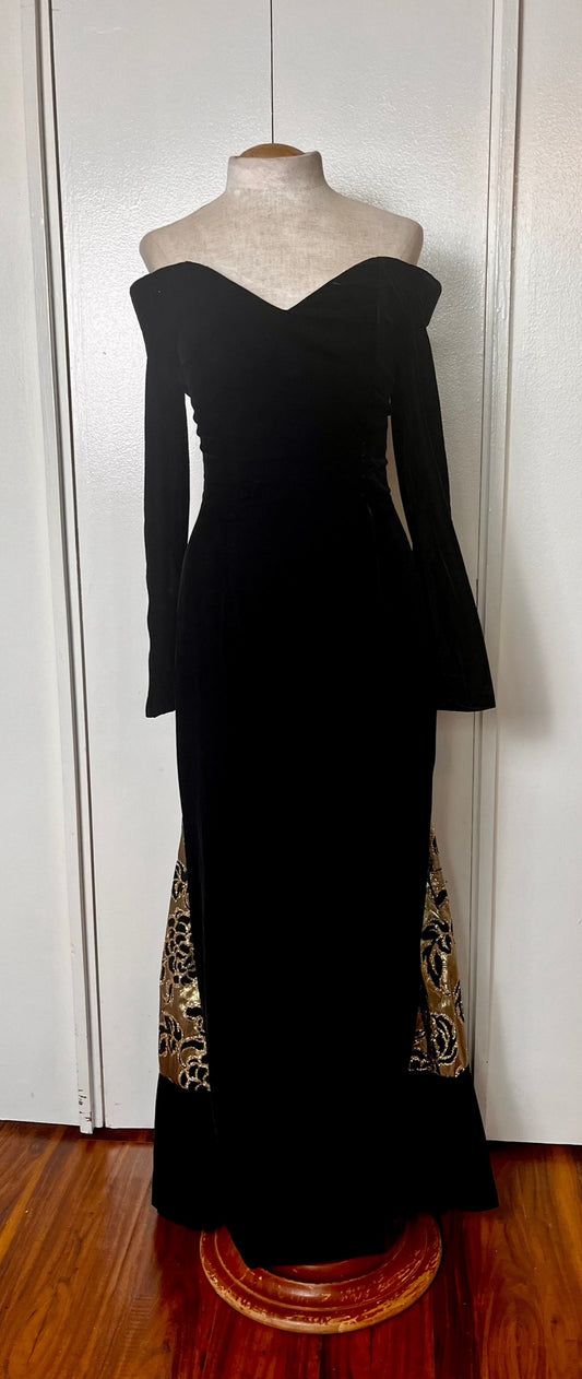 Vintage 1990's "Jessica McClintock" Black Velvet with Gold & Black Train Long Sleeve Off the Shoulder Maxi Dress