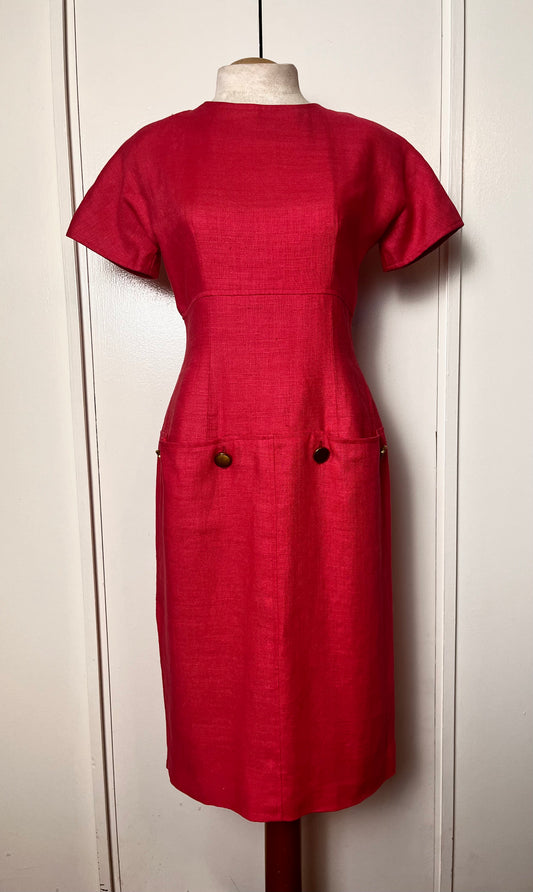 Vintage 1990's "Oscar de la Renta" Pink Linen & Gold Button Sheath Dress
