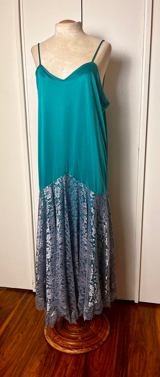 Vintage 1980's Teal Slip Handkerchief Lace Hem Maxi Dress