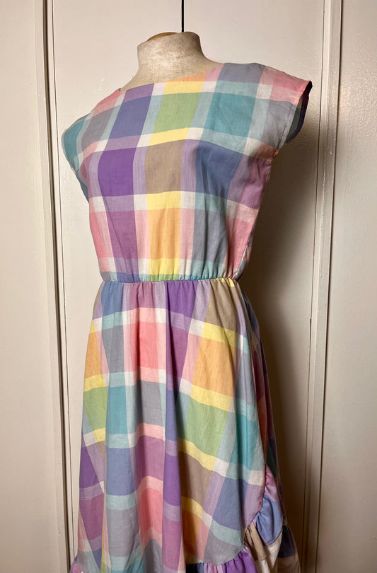 Vintage 1980's Pastel Rainbow Plaid & Ruffle Midi Dress