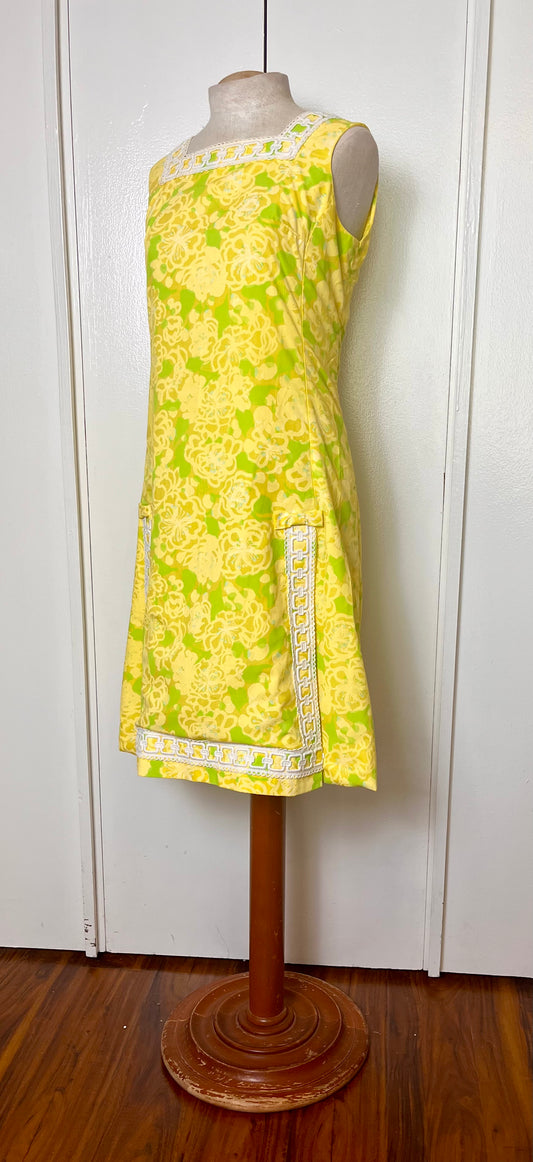 Vintage 1970's "Home-Sewn" (in the style of Lilly Pulitzer) Yellow Floral Mini Dress