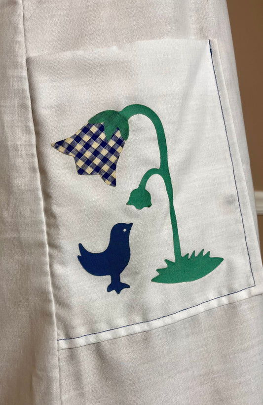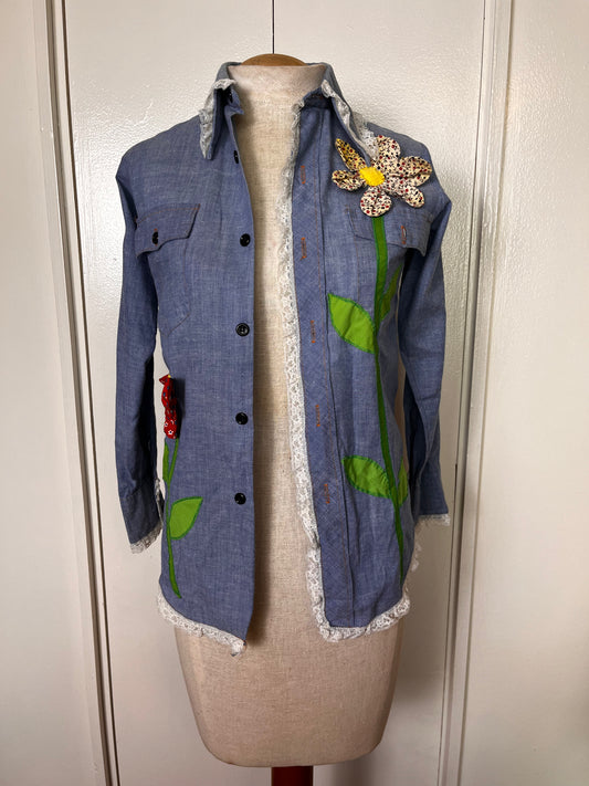 Vintage 1970's "JCPenney" Denim Chambray Long Sleeve Blouse with Patchwork Flower Appliqués