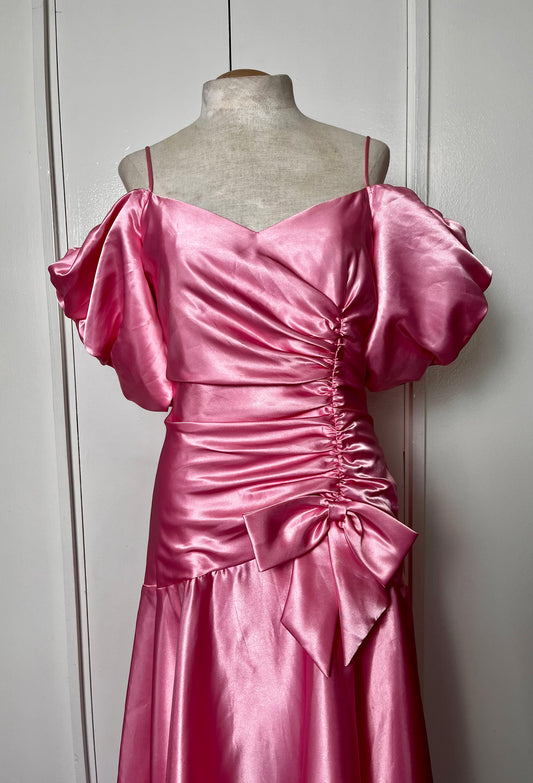 Vintage 1980's "Union-Made" Pink Satin Puff Sleeve Ruched High-Low Dress