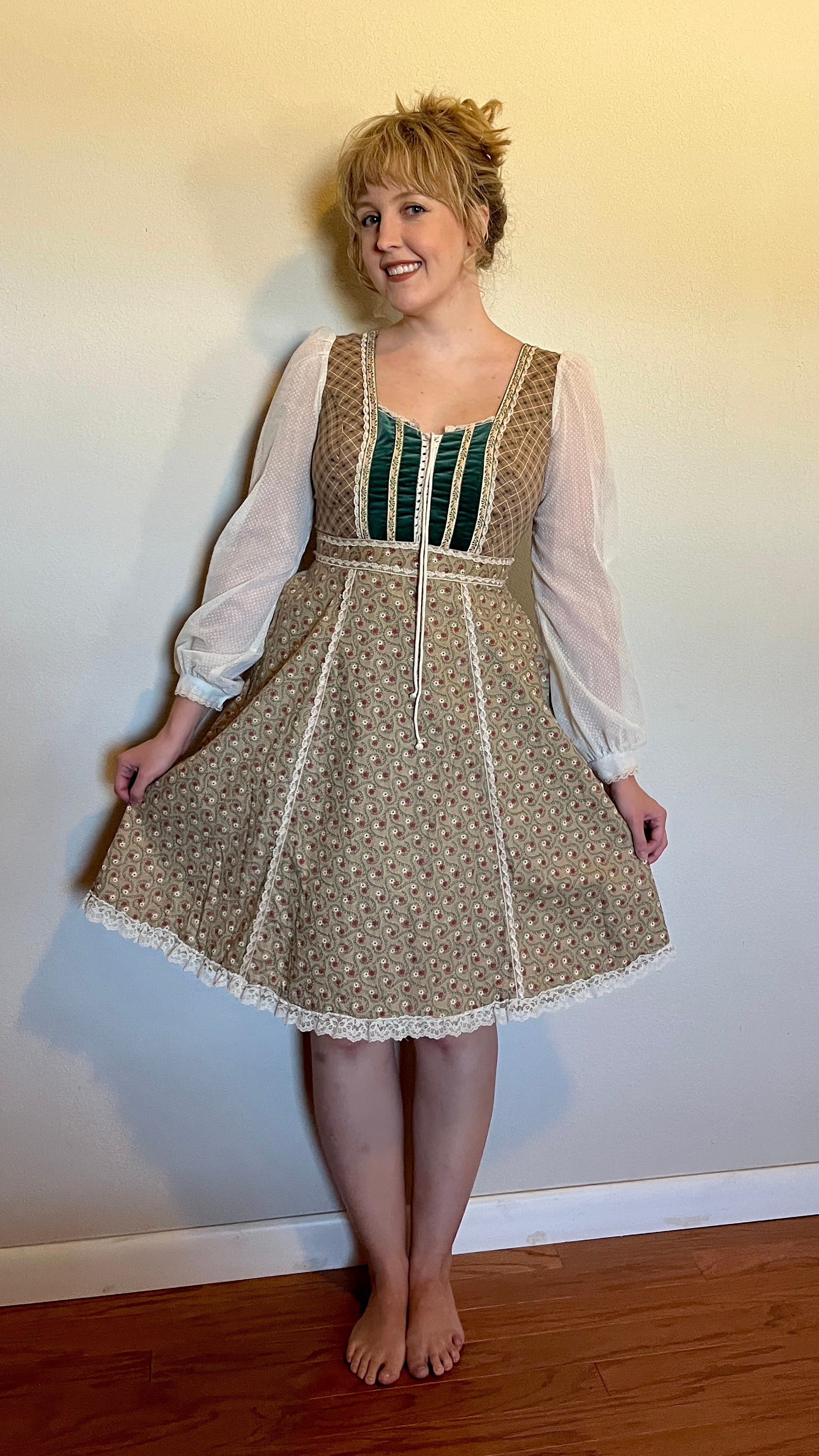 Vintage 1970’s "Gunne Sax by Jessica McClintock" Beige & Green Calico & Velvet Midi Dress (Altered)