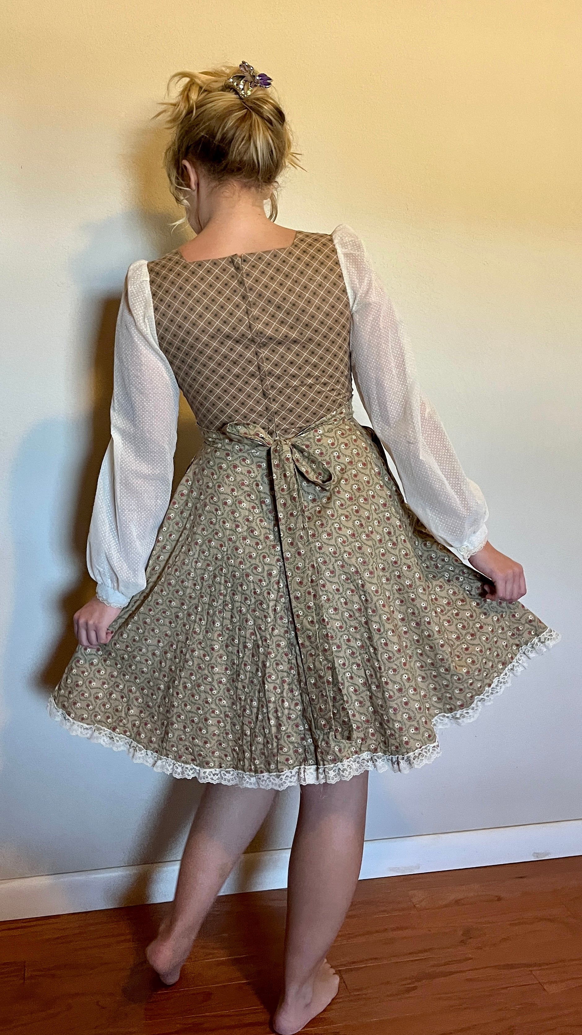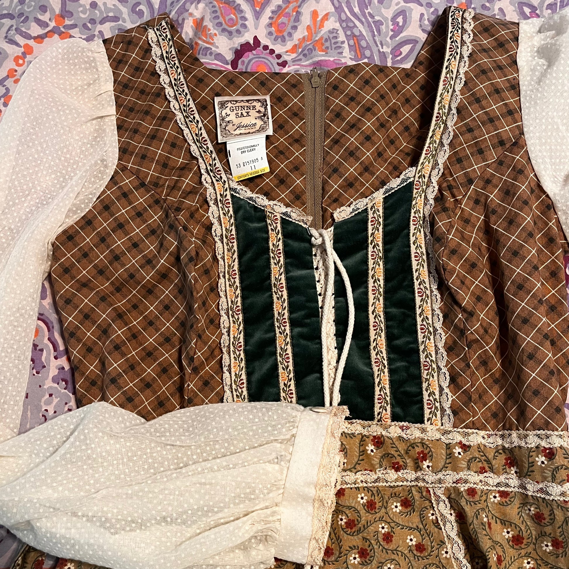 1970’s Gunne Sax Beige & Green Calico & Velvet Midi Dress (Altered)