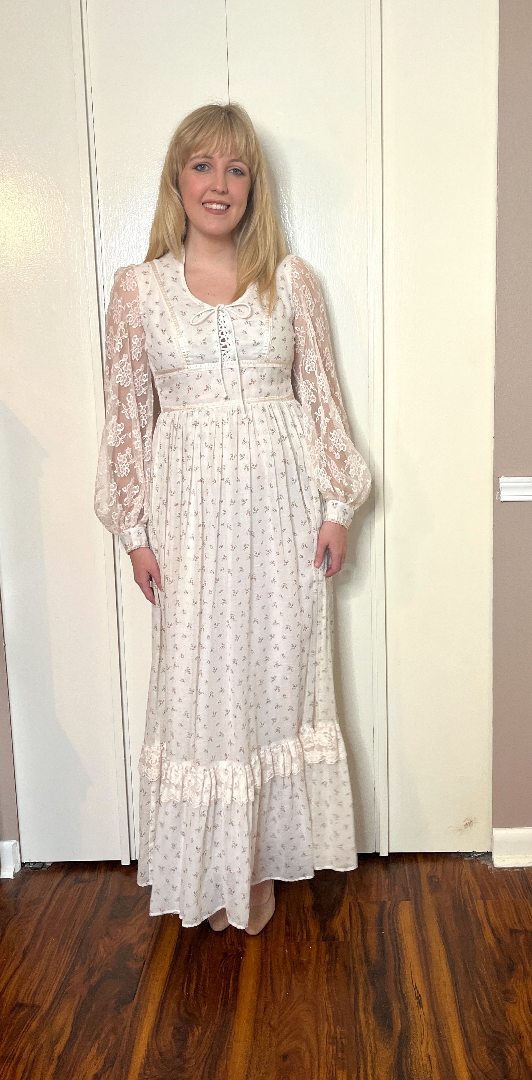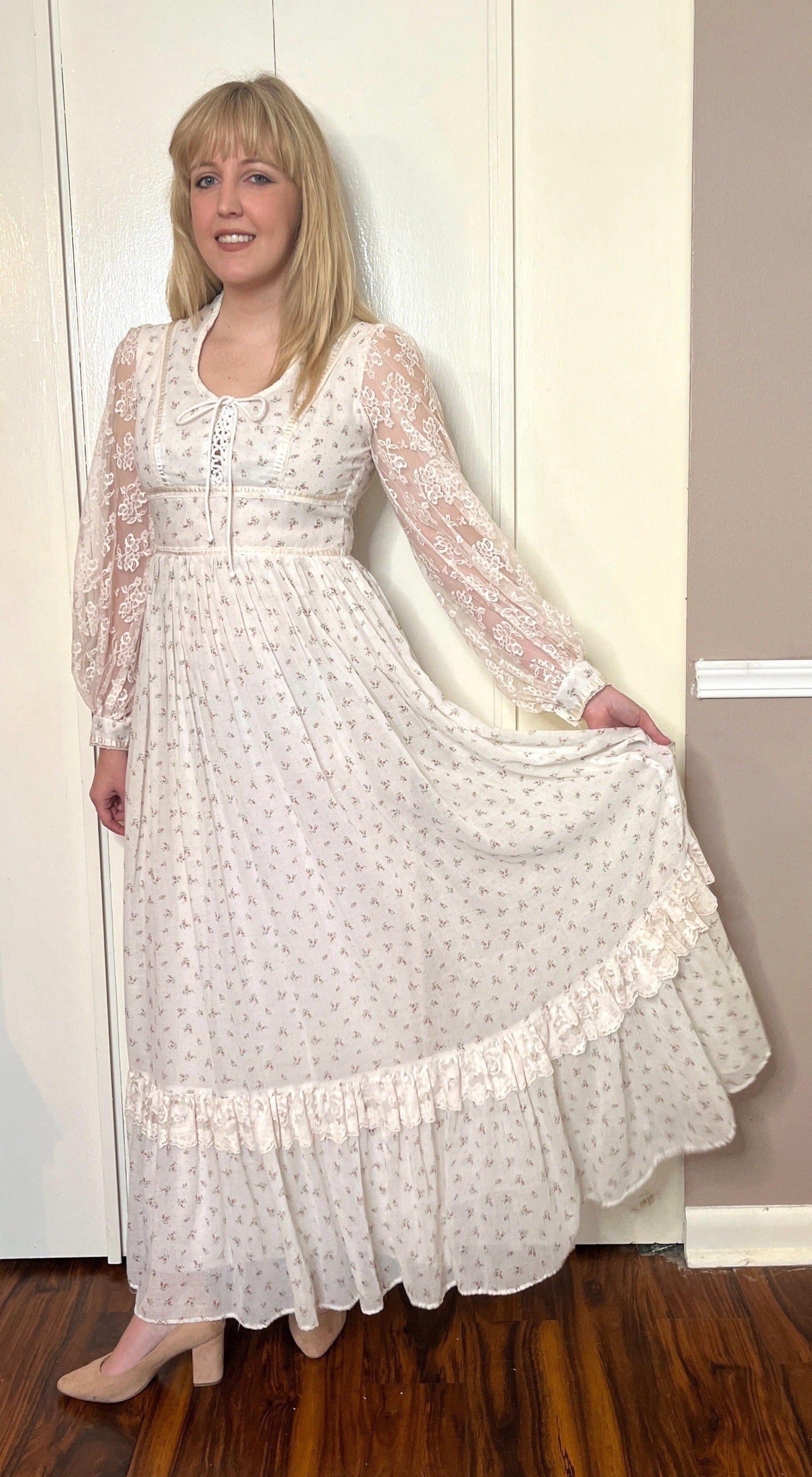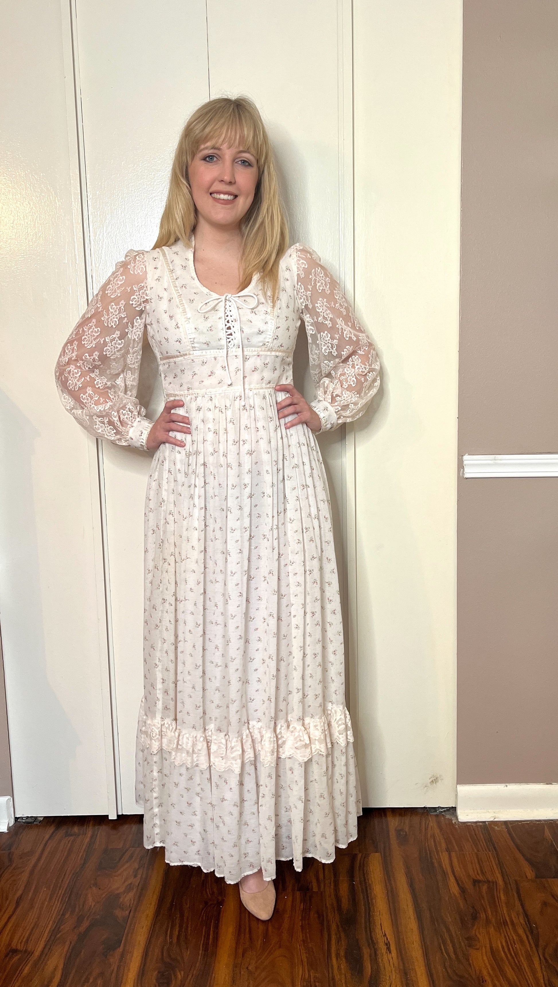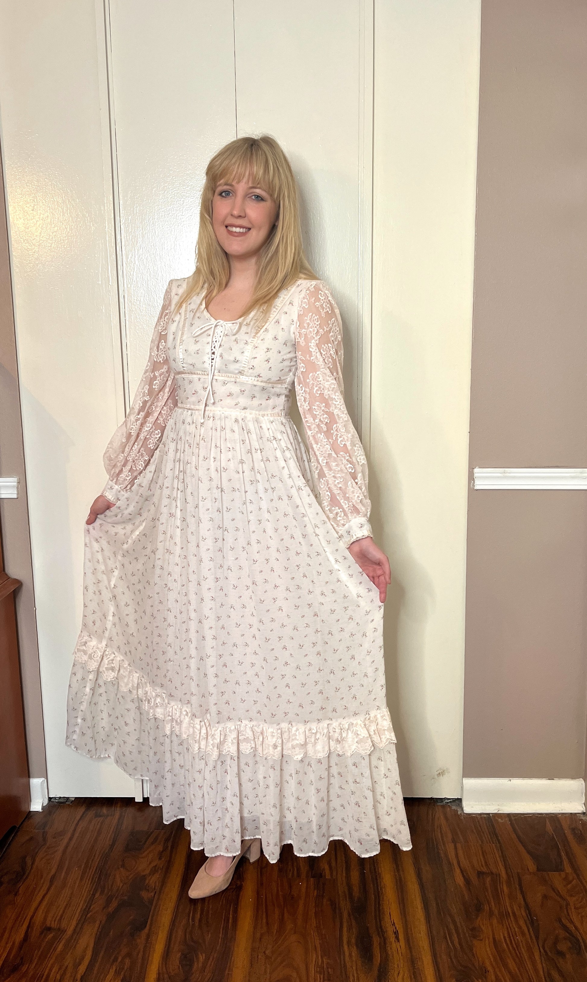 Vintage 1970’s "Gunne Sax by Jessica McClintock" White and Rosebuds Long Sleeve Maxi Dress