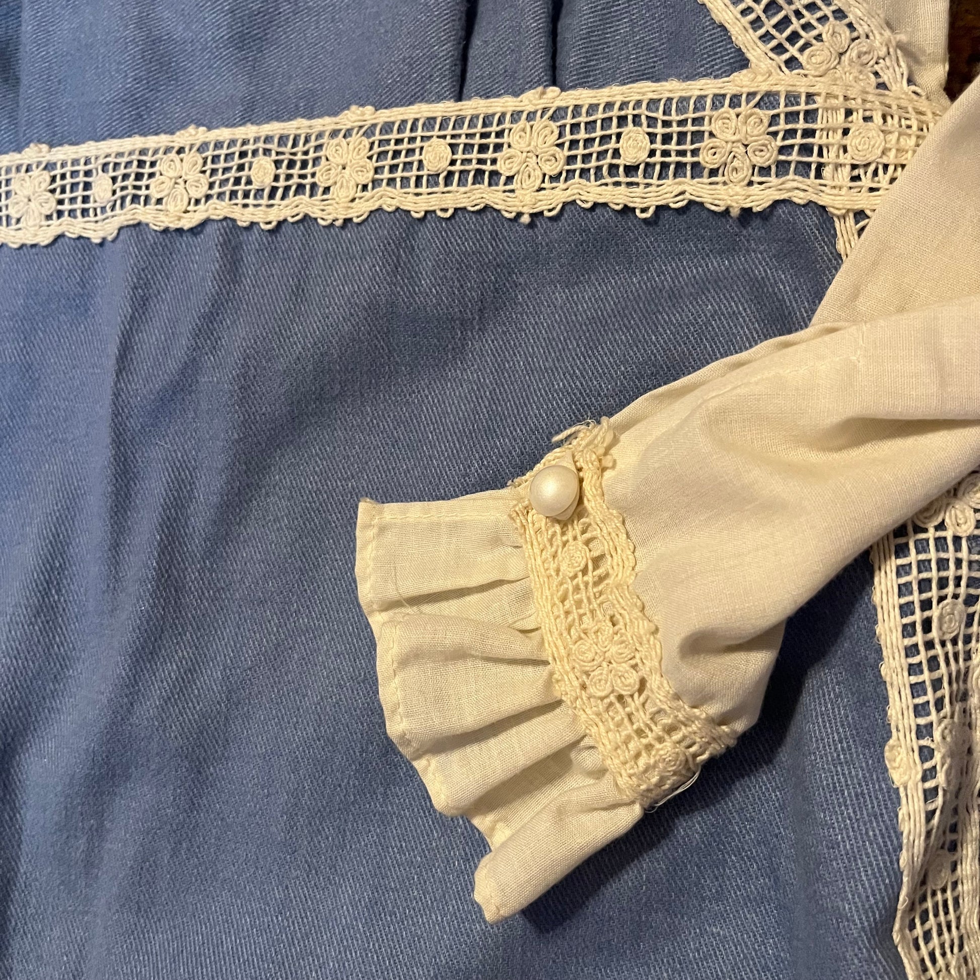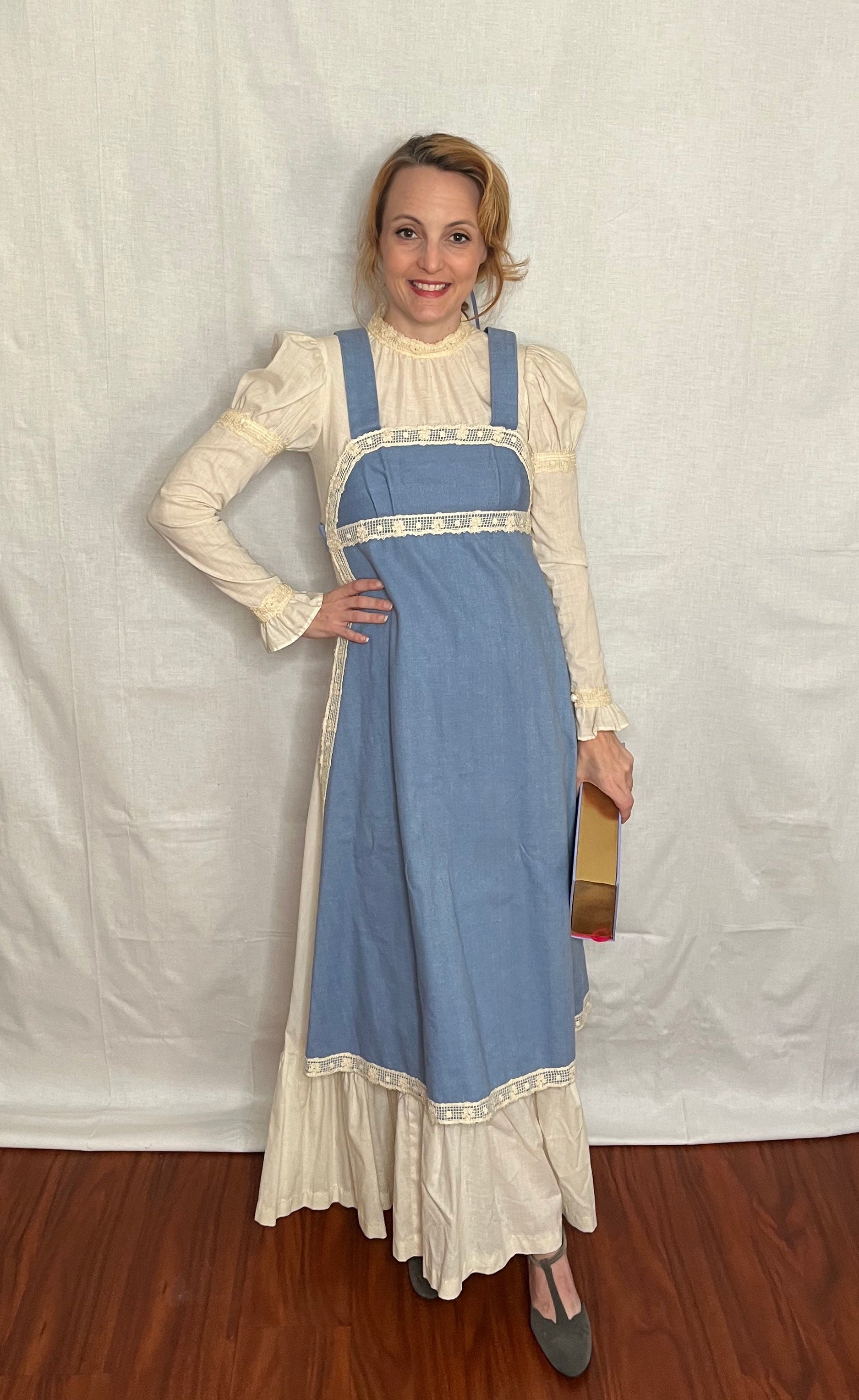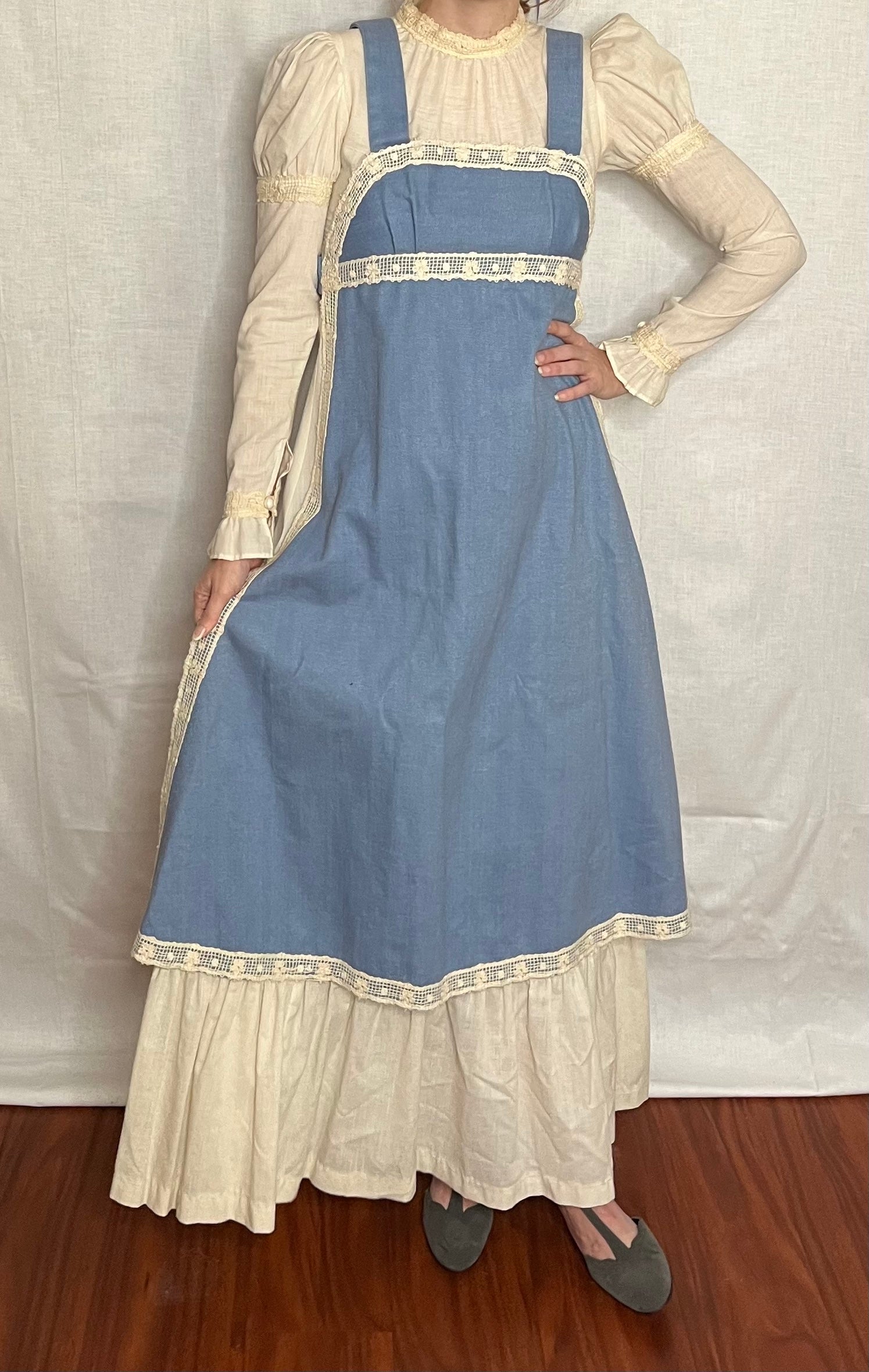 Vintage 1960’s "Gunne Sax of California" Denim Chambray and Cotton Muslin Apron Front Long Sleeve Maxi Dress