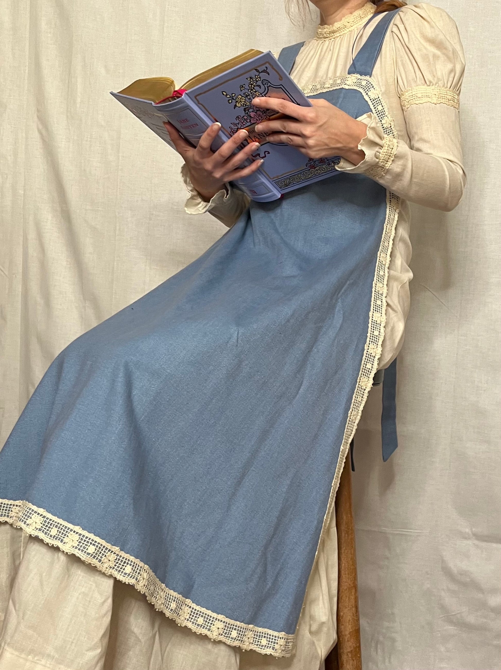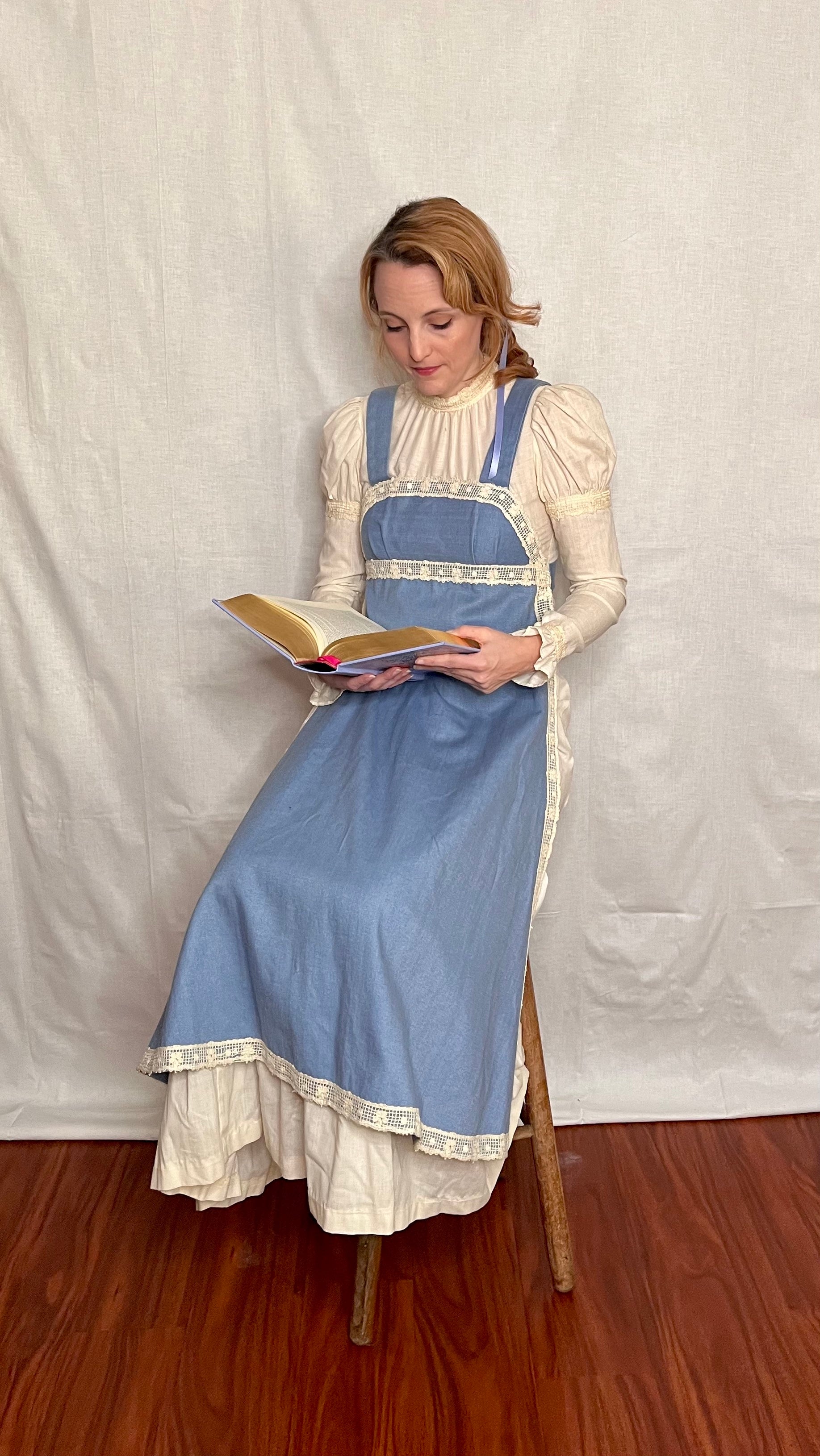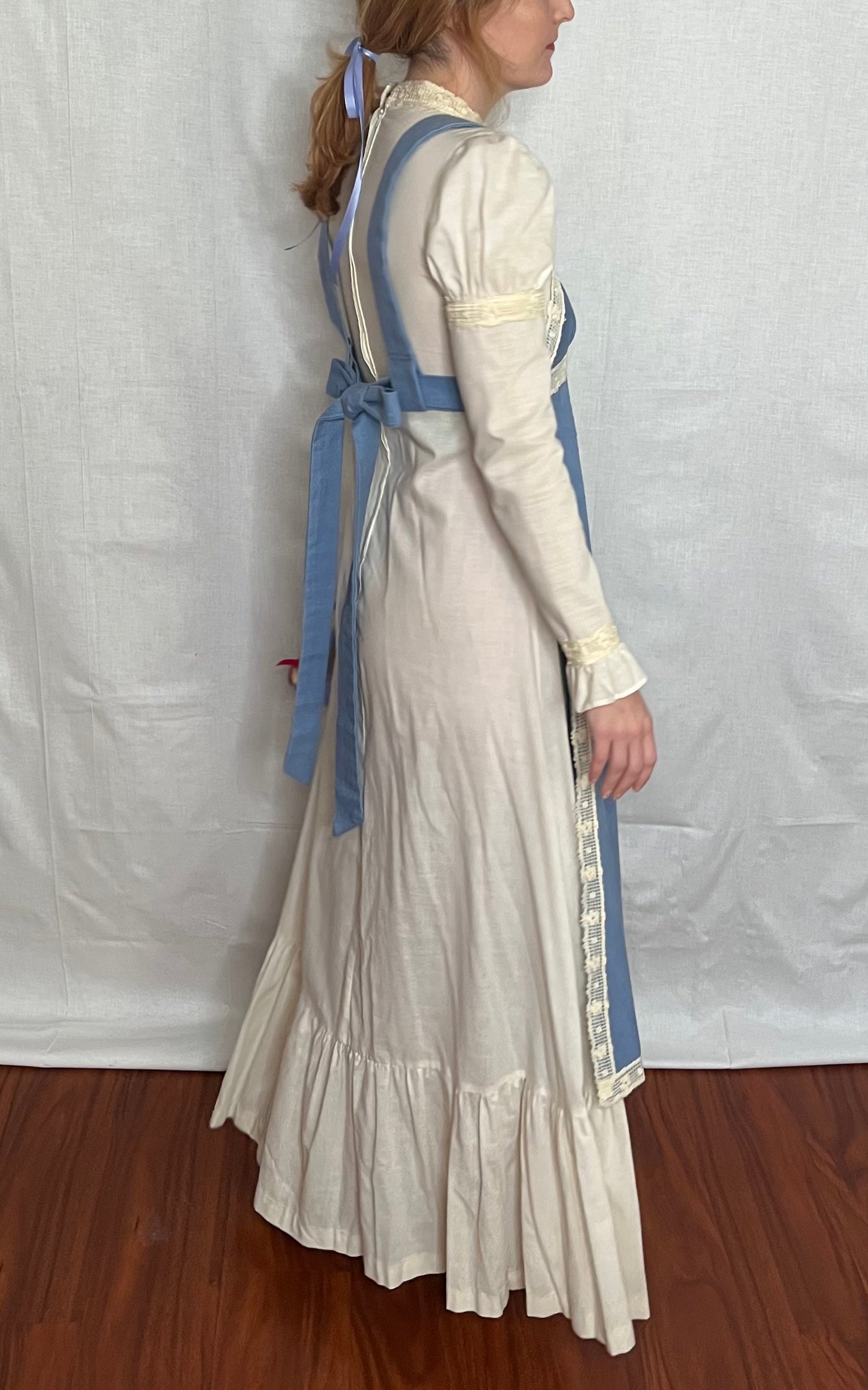 Vintage 1960’s "Gunne Sax of California" Denim Chambray and Cotton Muslin Apron Front Long Sleeve Maxi Dress