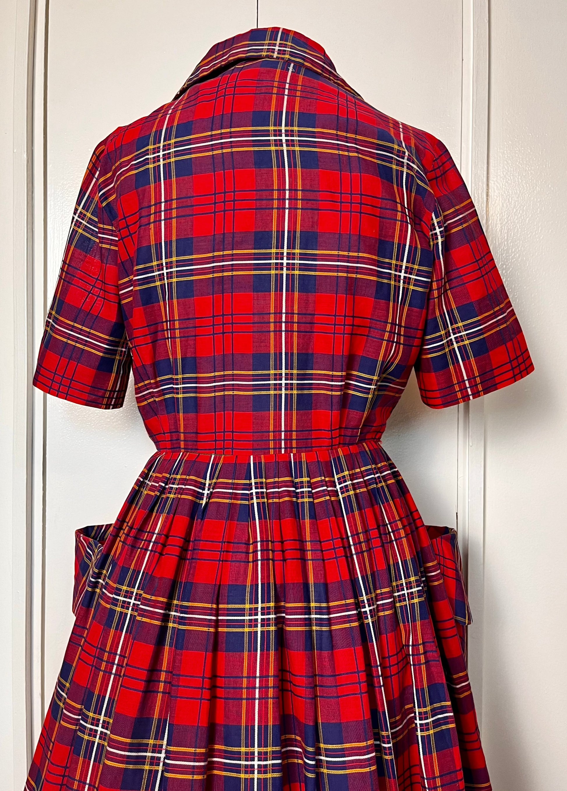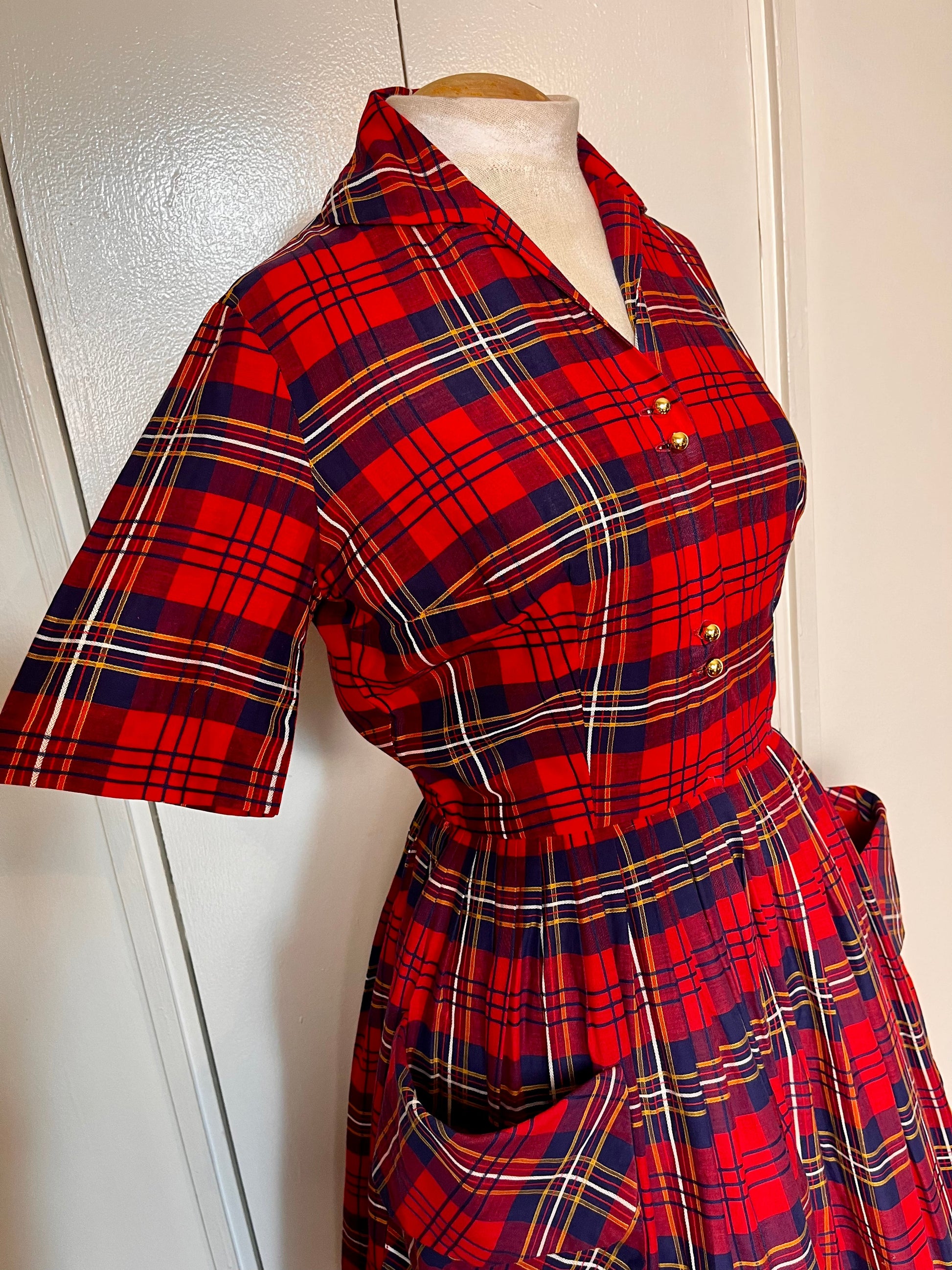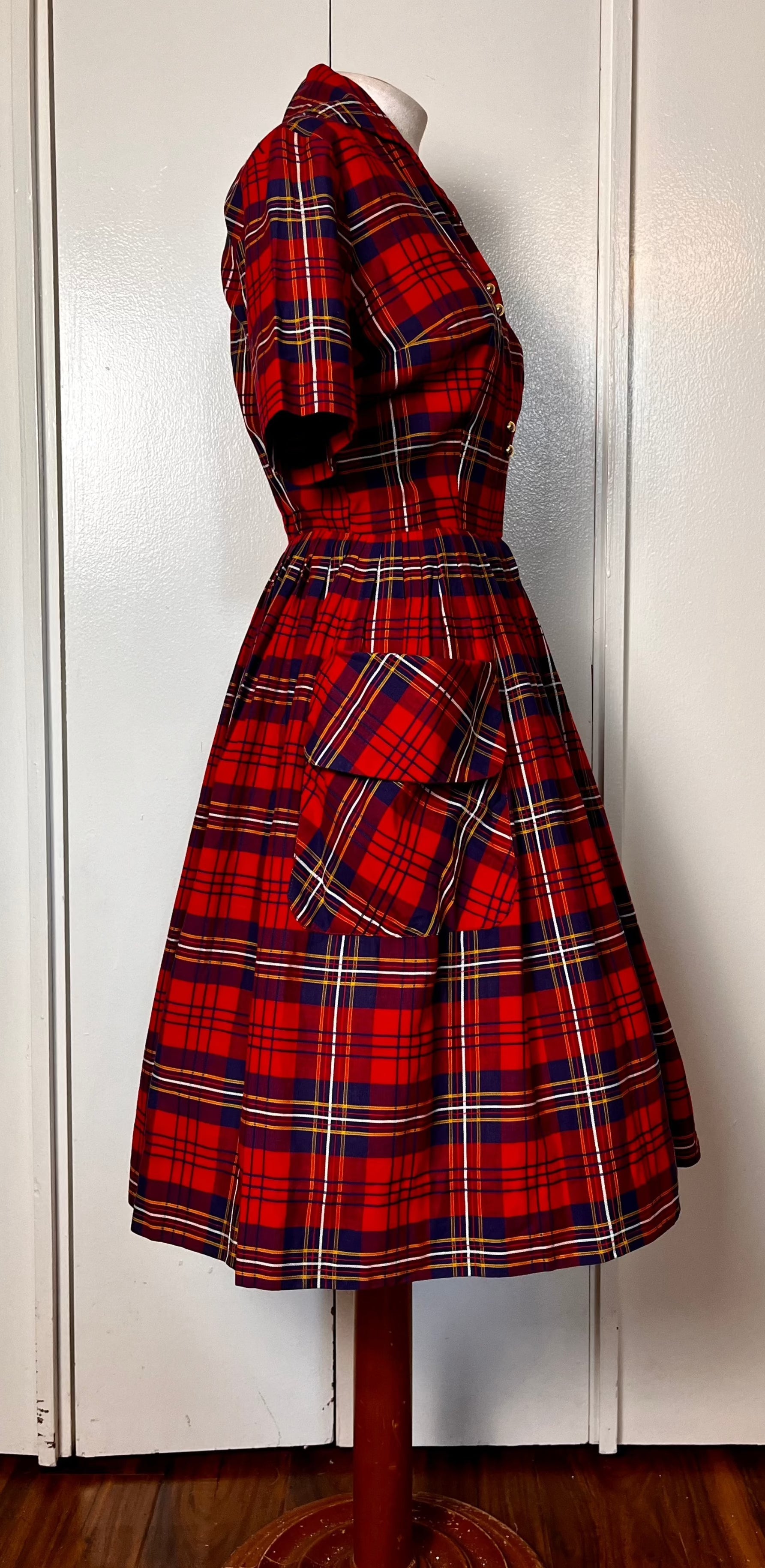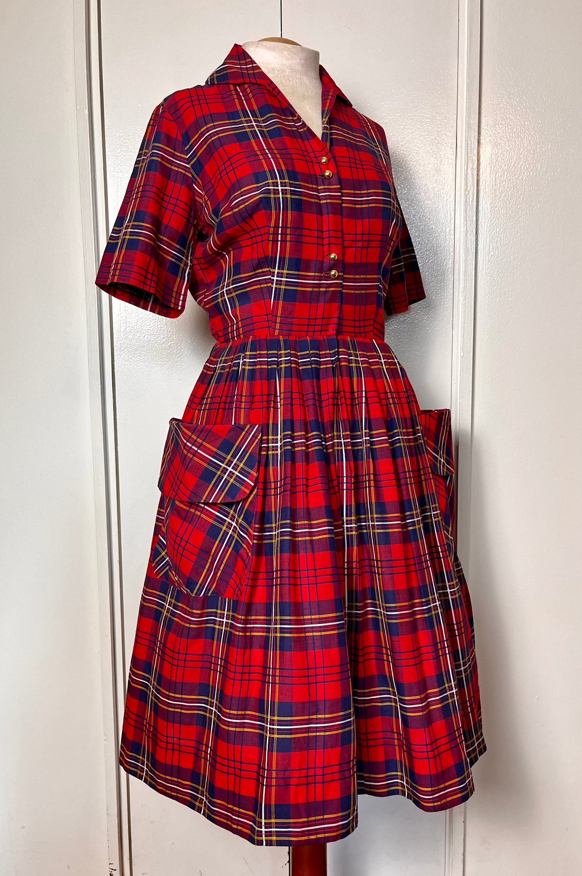 Vintage 1950's Shirtwaist Dress in Red Cotton Plaid with Gold Buttons & Saddlebag Pockets