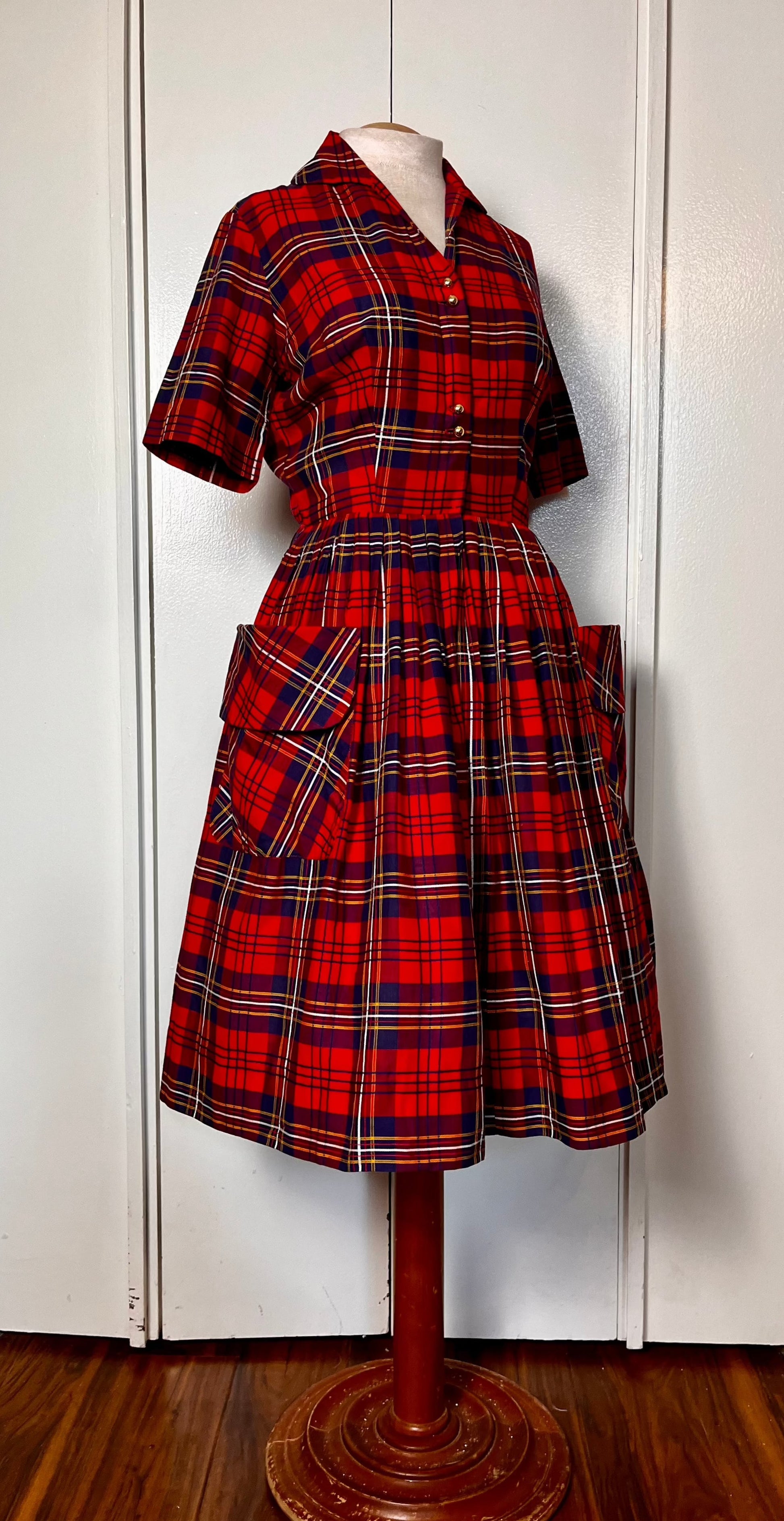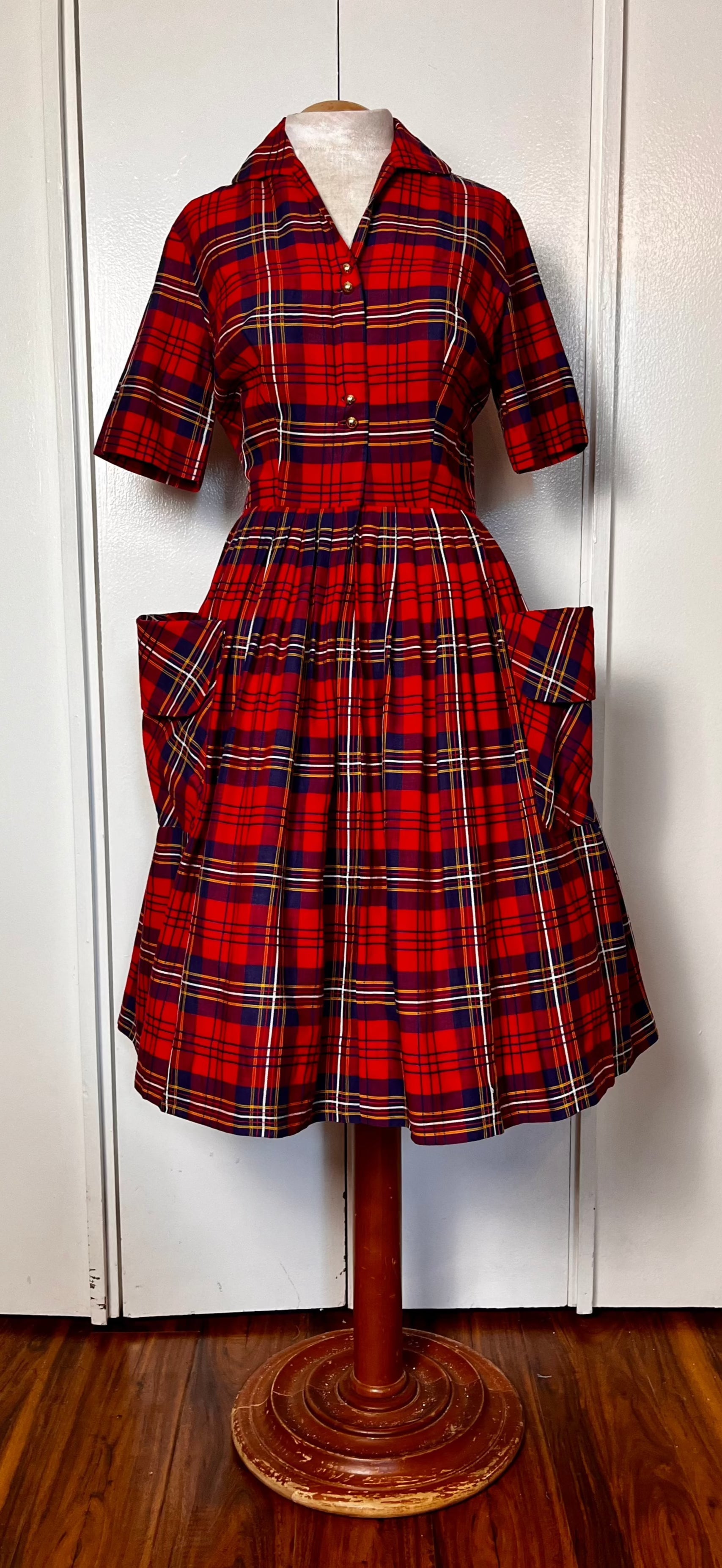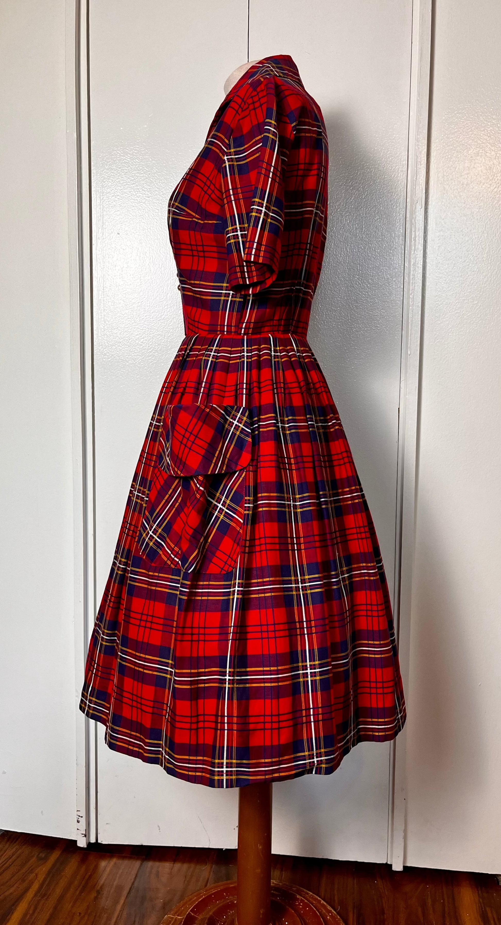 Vintage 1950's Shirtwaist Dress in Red Cotton Plaid with Gold Buttons & Saddlebag Pockets