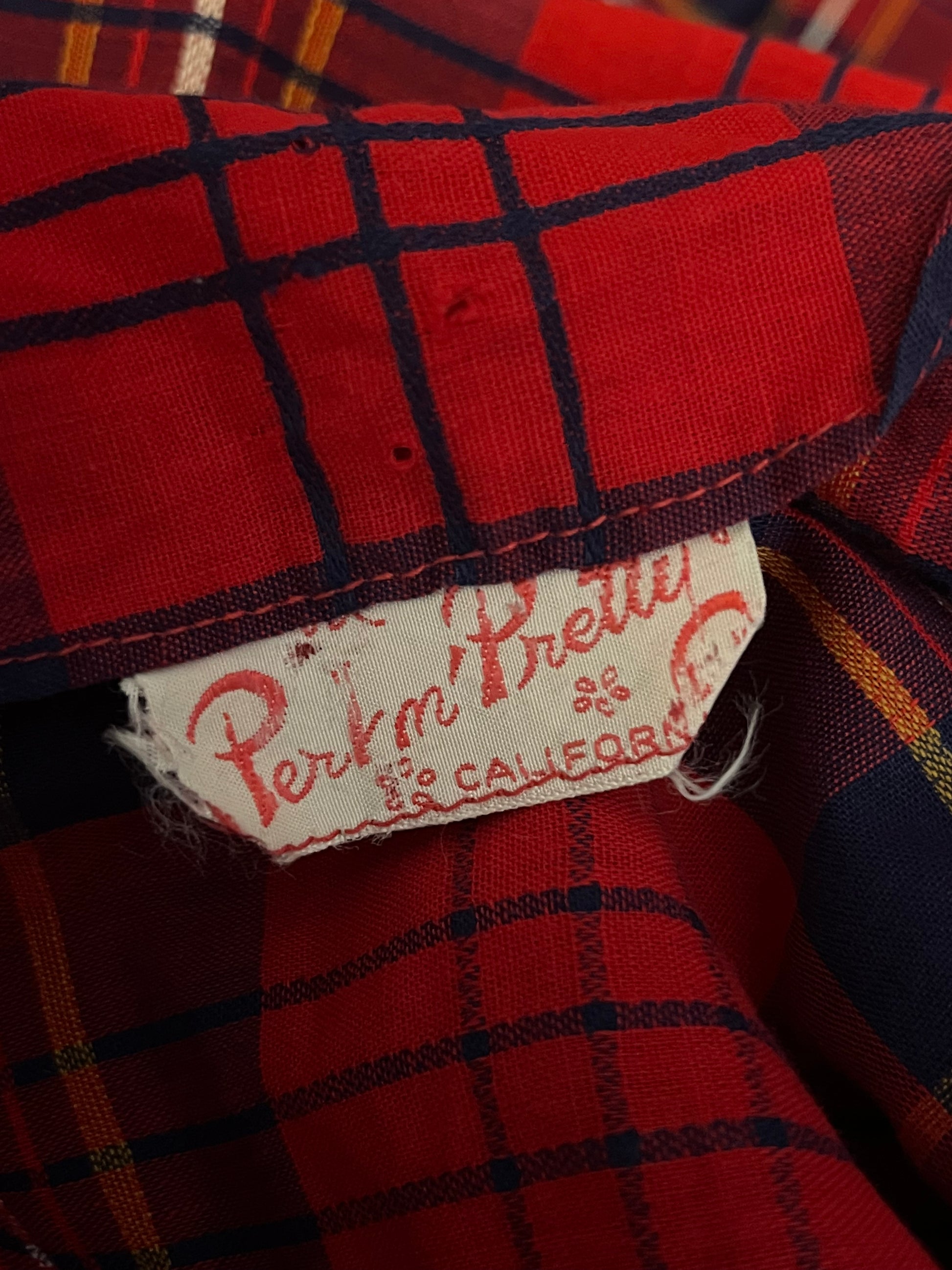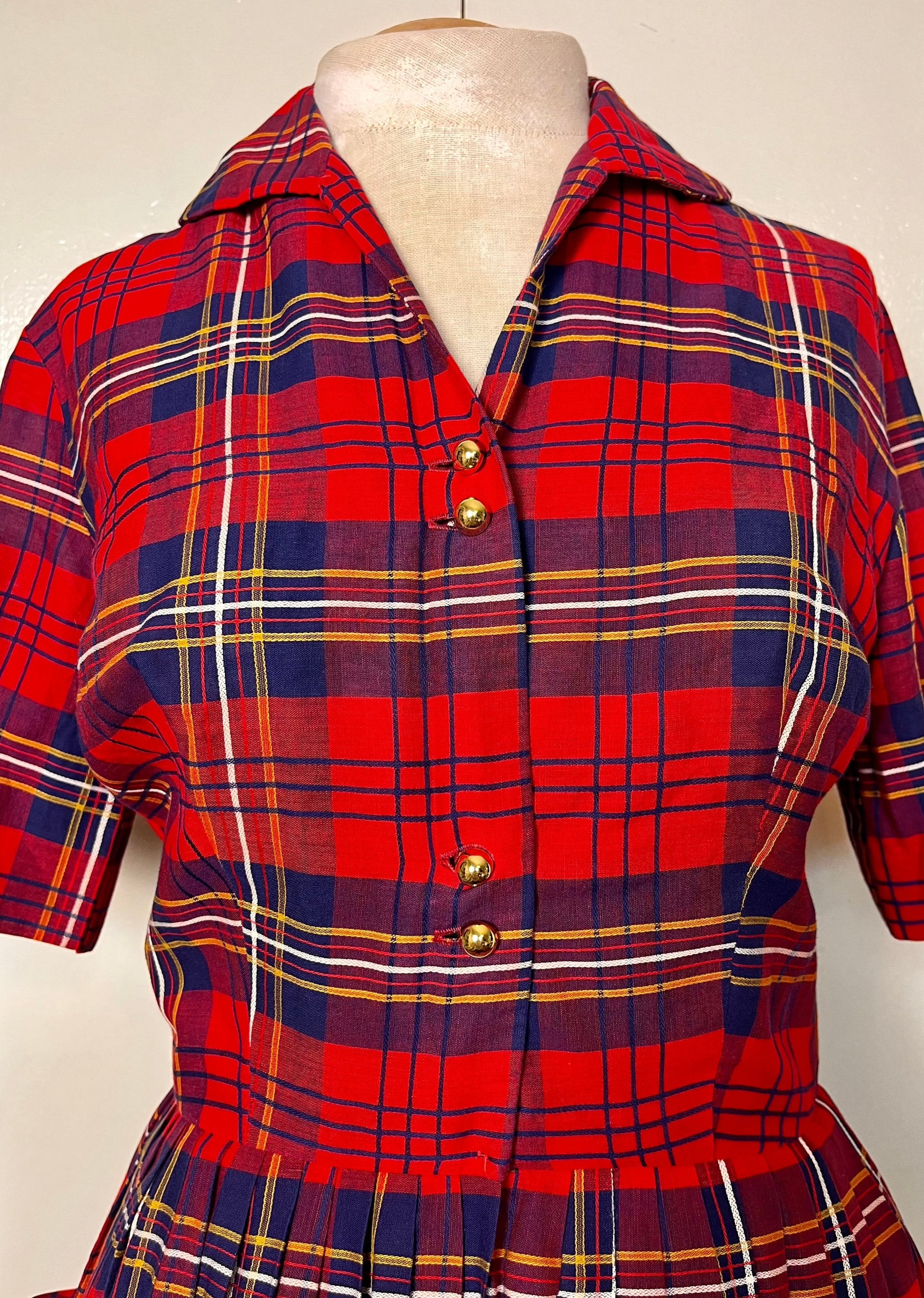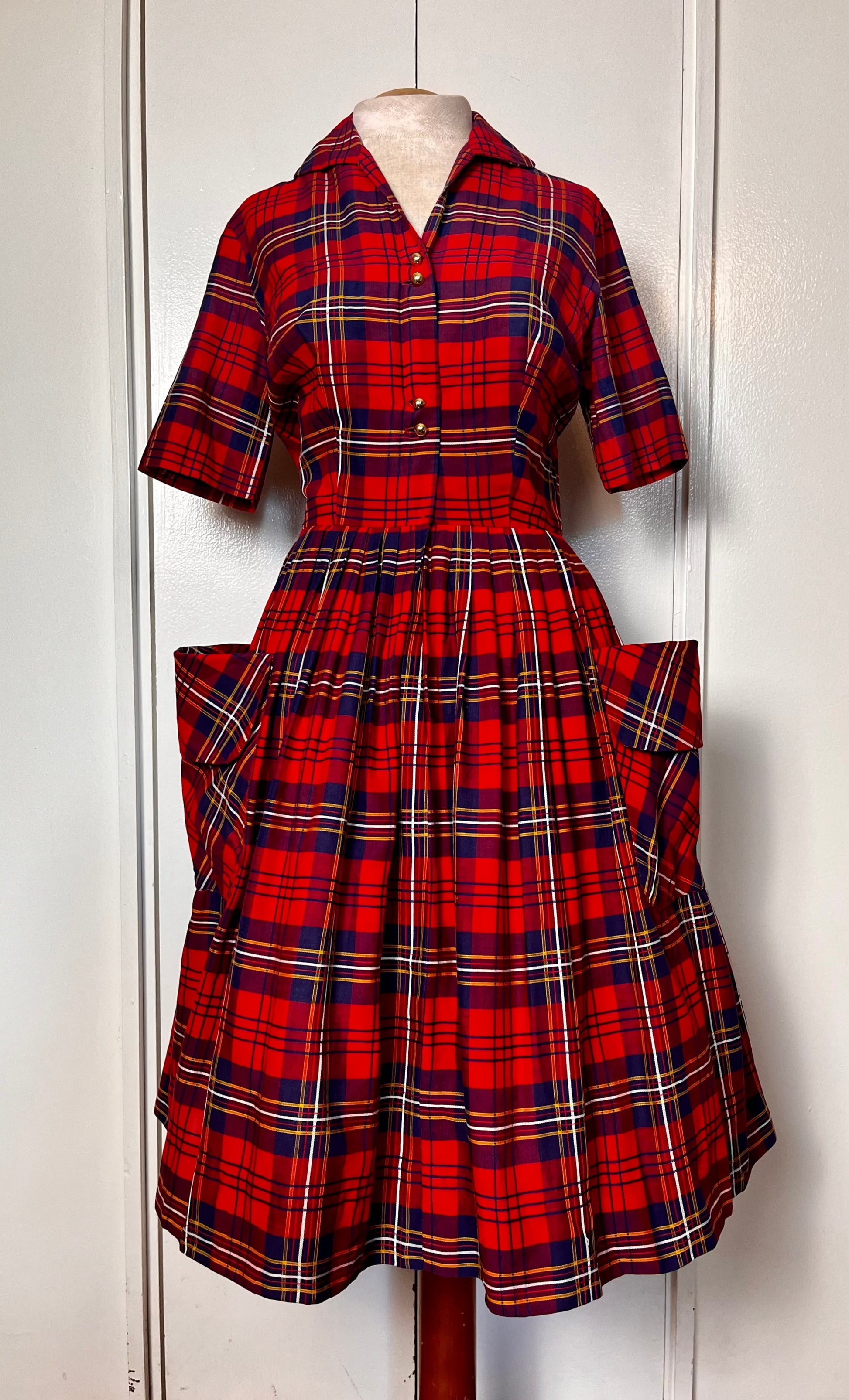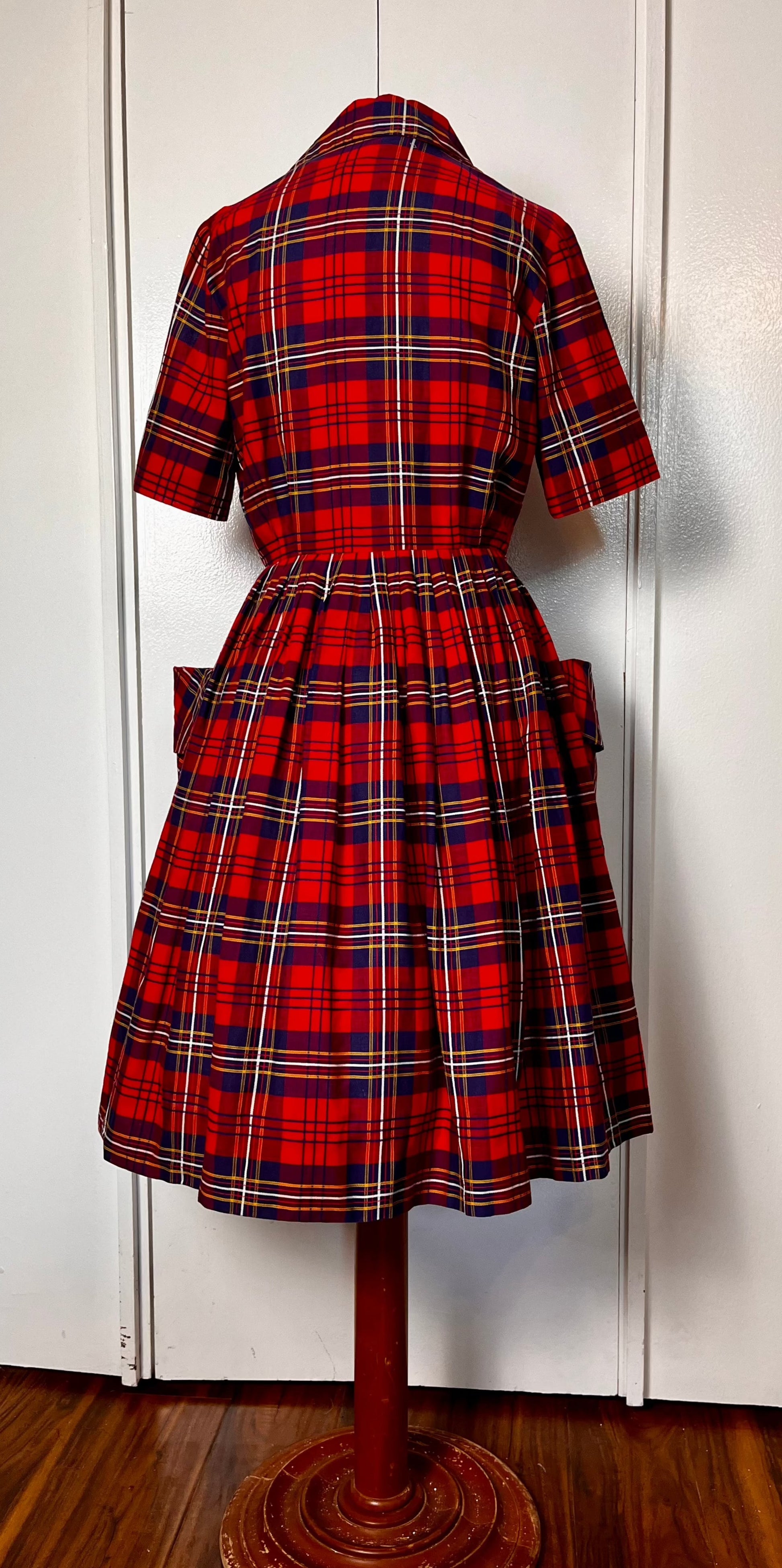 Vintage 1950's Shirtwaist Dress in Red Cotton Plaid with Gold Buttons & Saddlebag Pockets