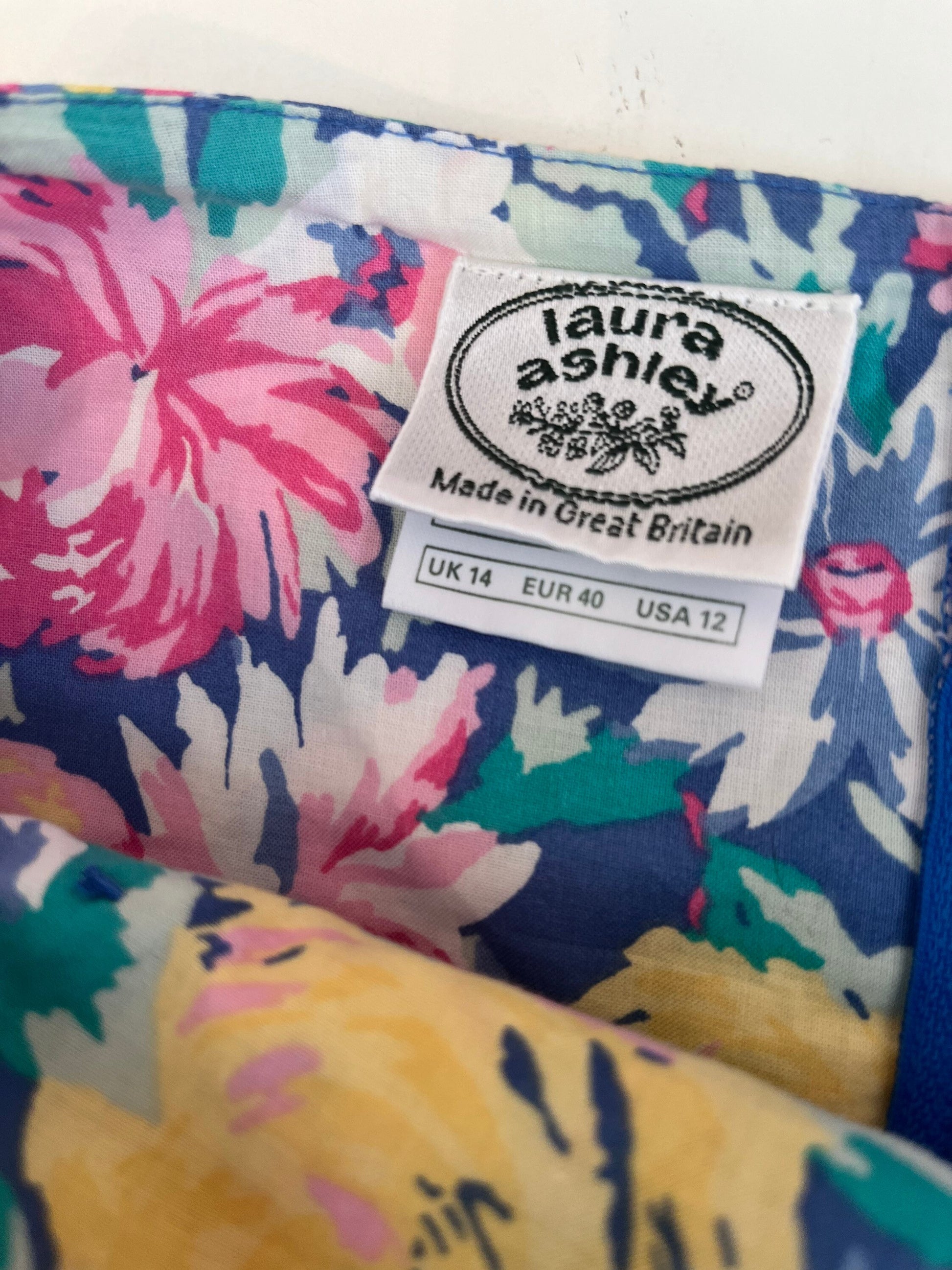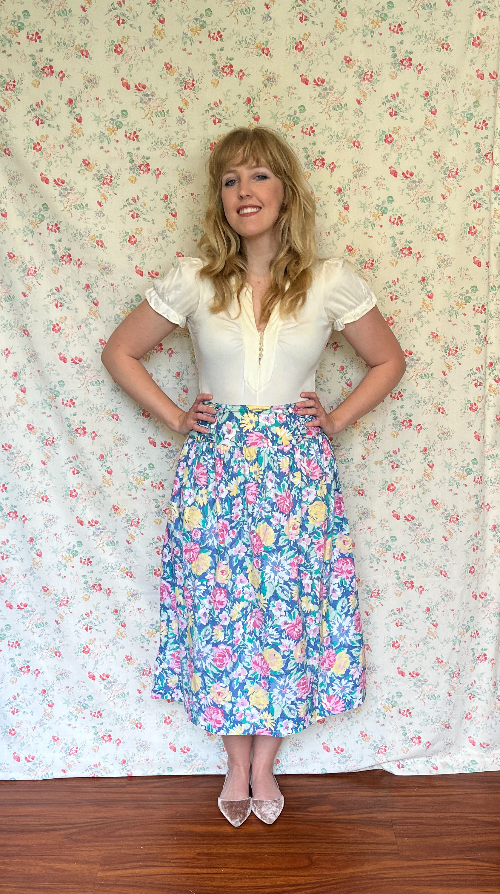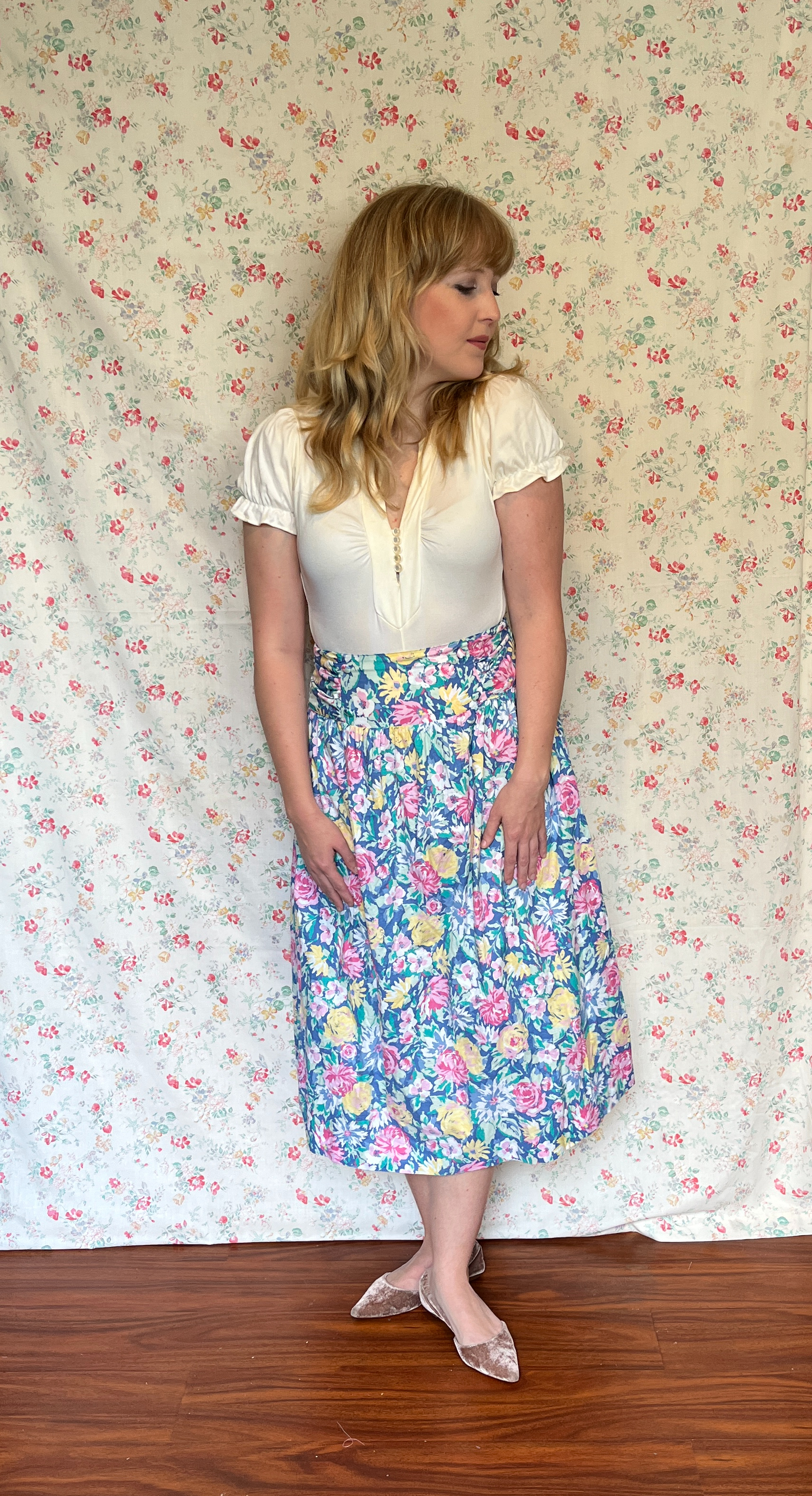 Vintage 1980’s "Laura Ashley" Blue, Pink & Yellow Floral Midi Skirt with Sash
