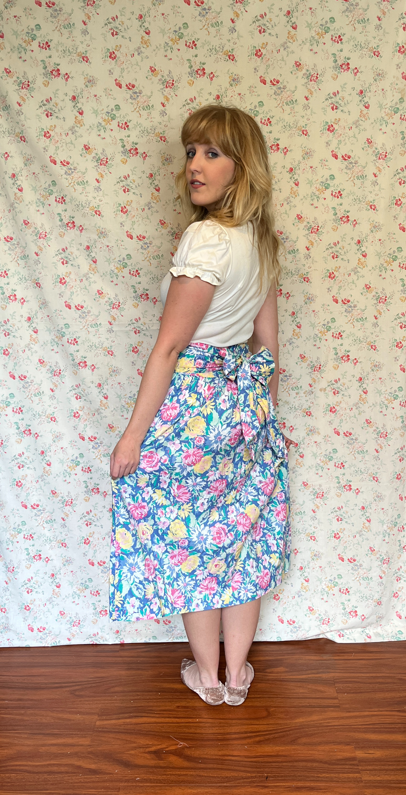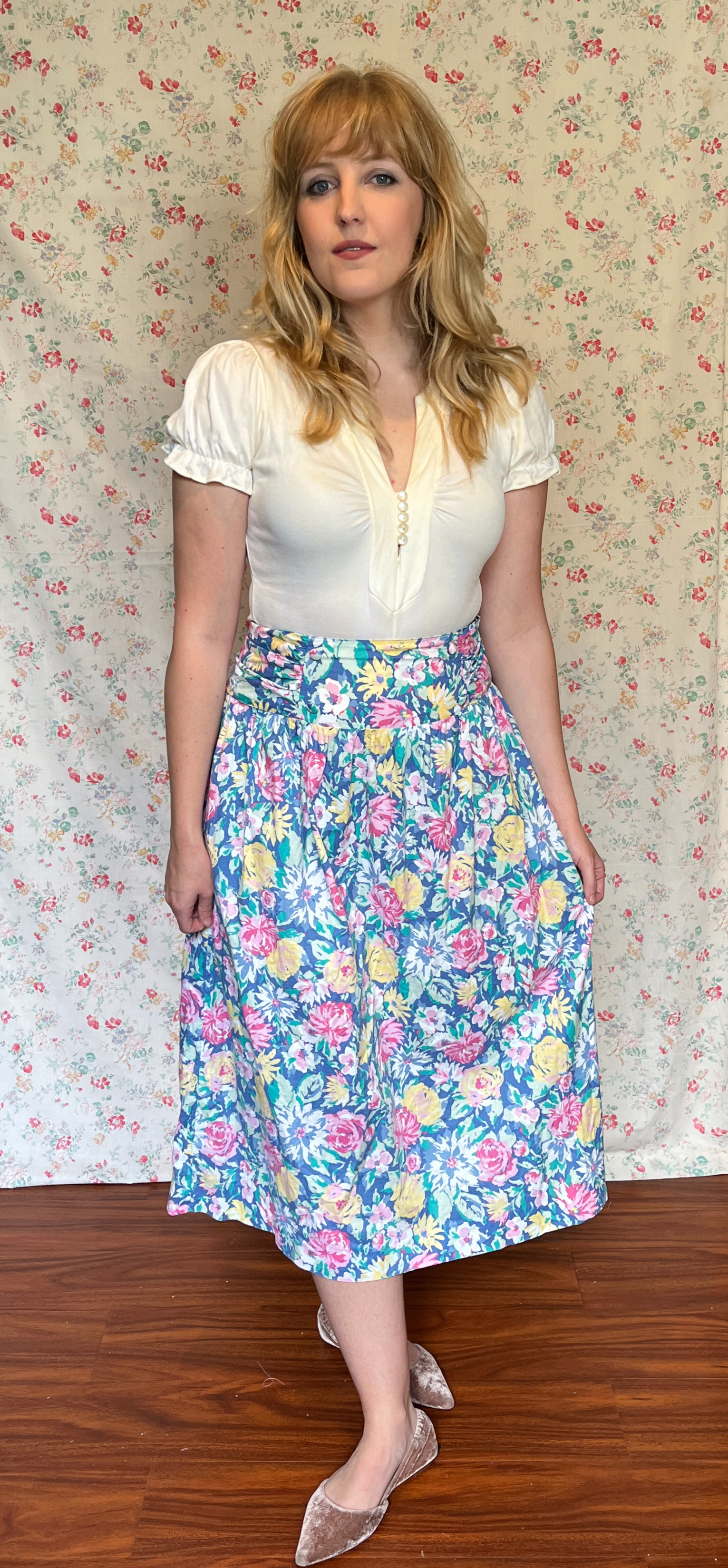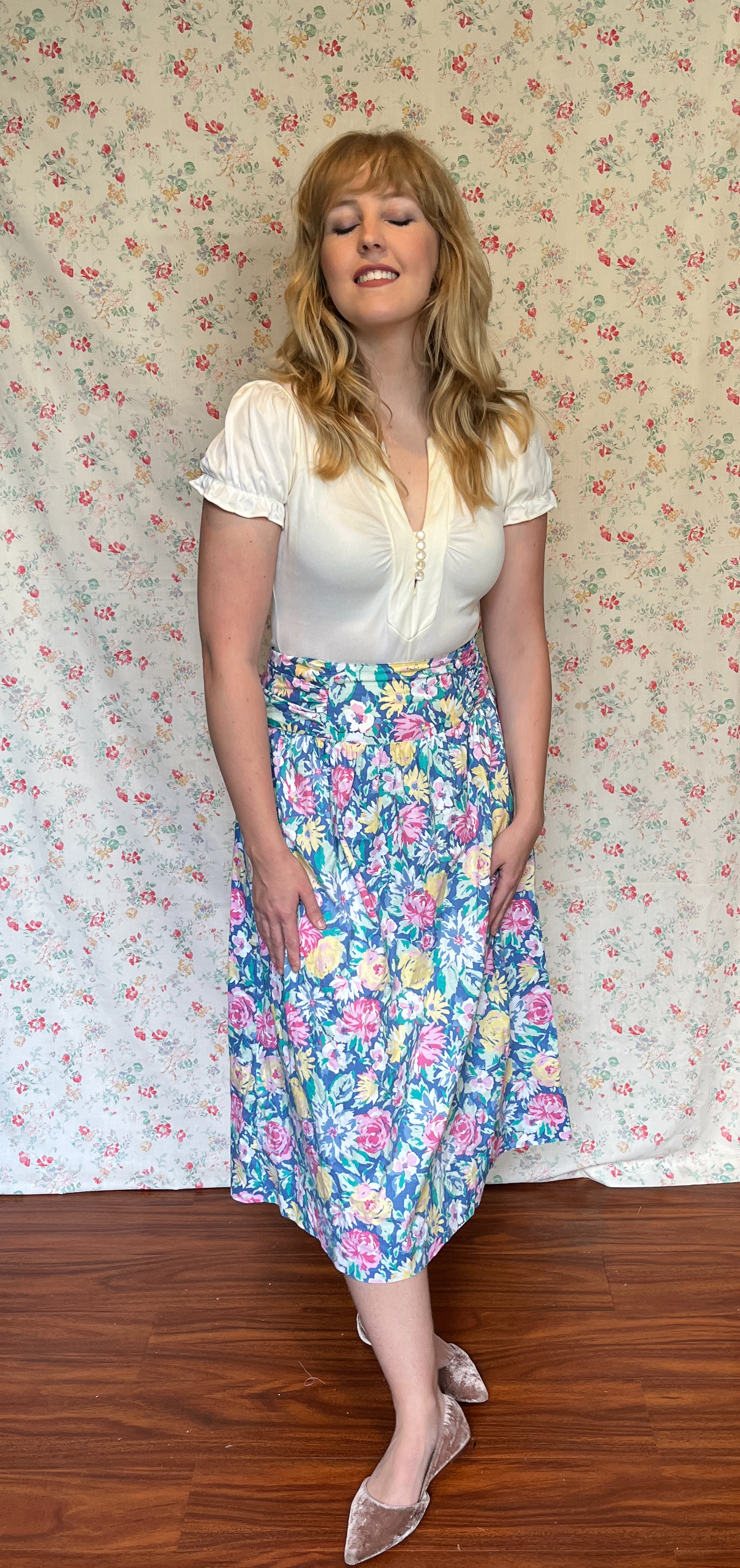 Vintage 1980’s "Laura Ashley" Blue, Pink & Yellow Floral Midi Skirt with Sash