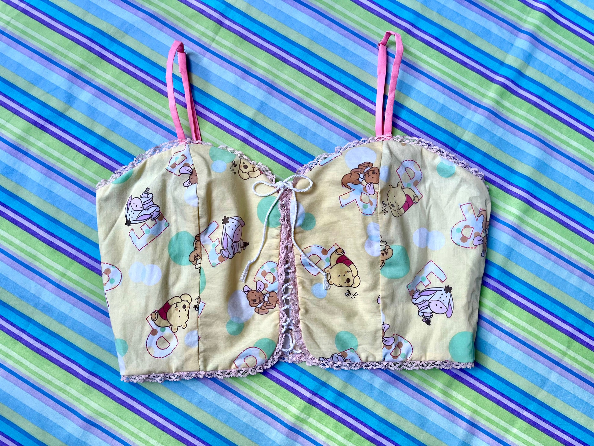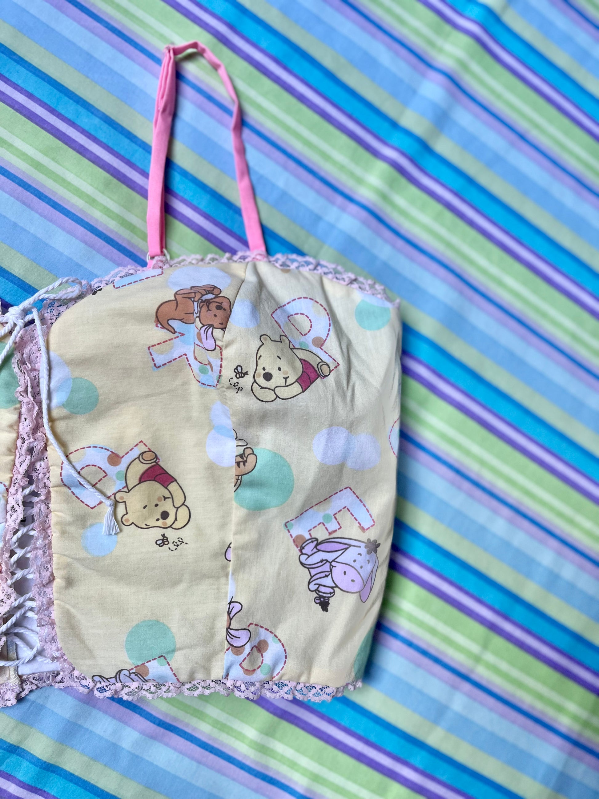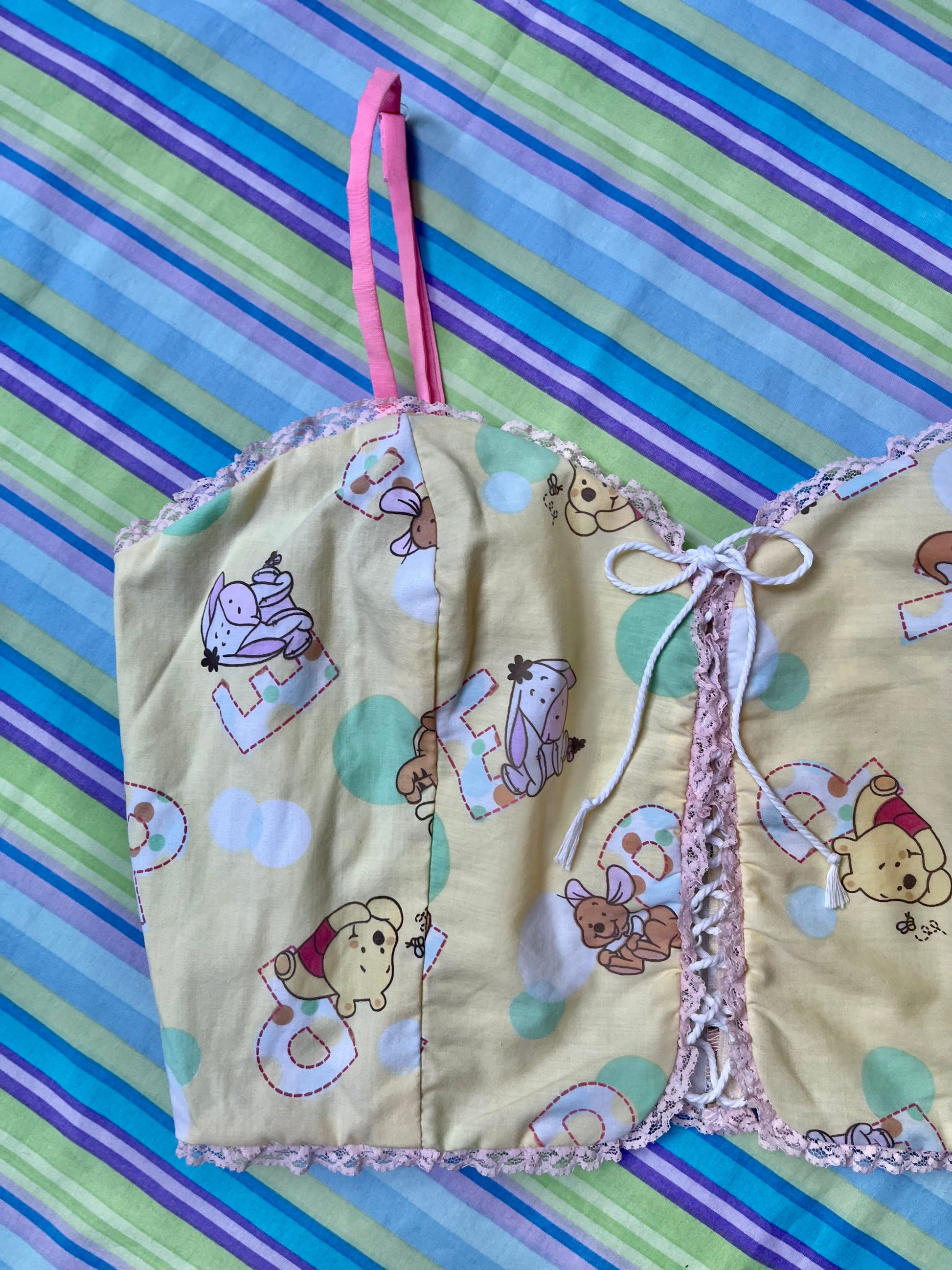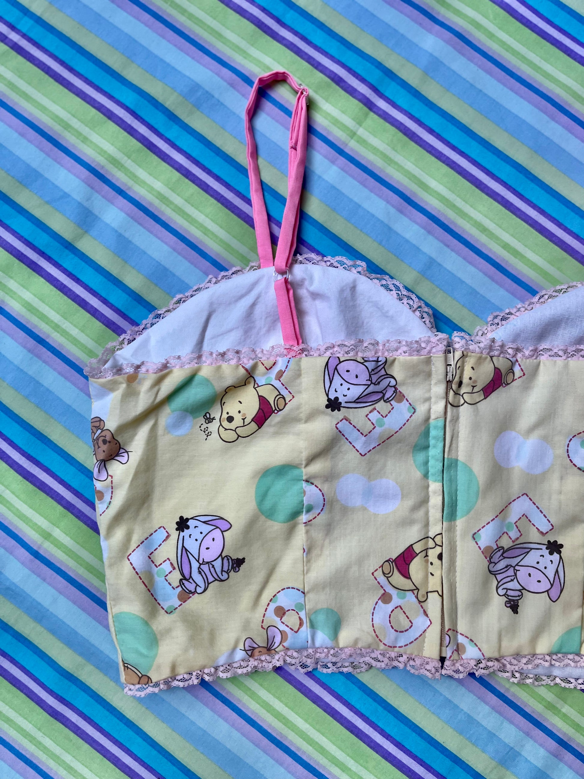 Using primarily bed linens, curtains, scrub tops, and other miscellaneous secondhand fabrics, we have made these corset tops as apart of our Nostalgia collection.