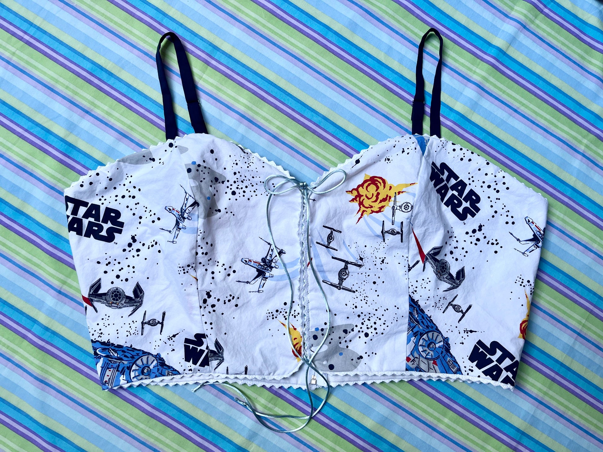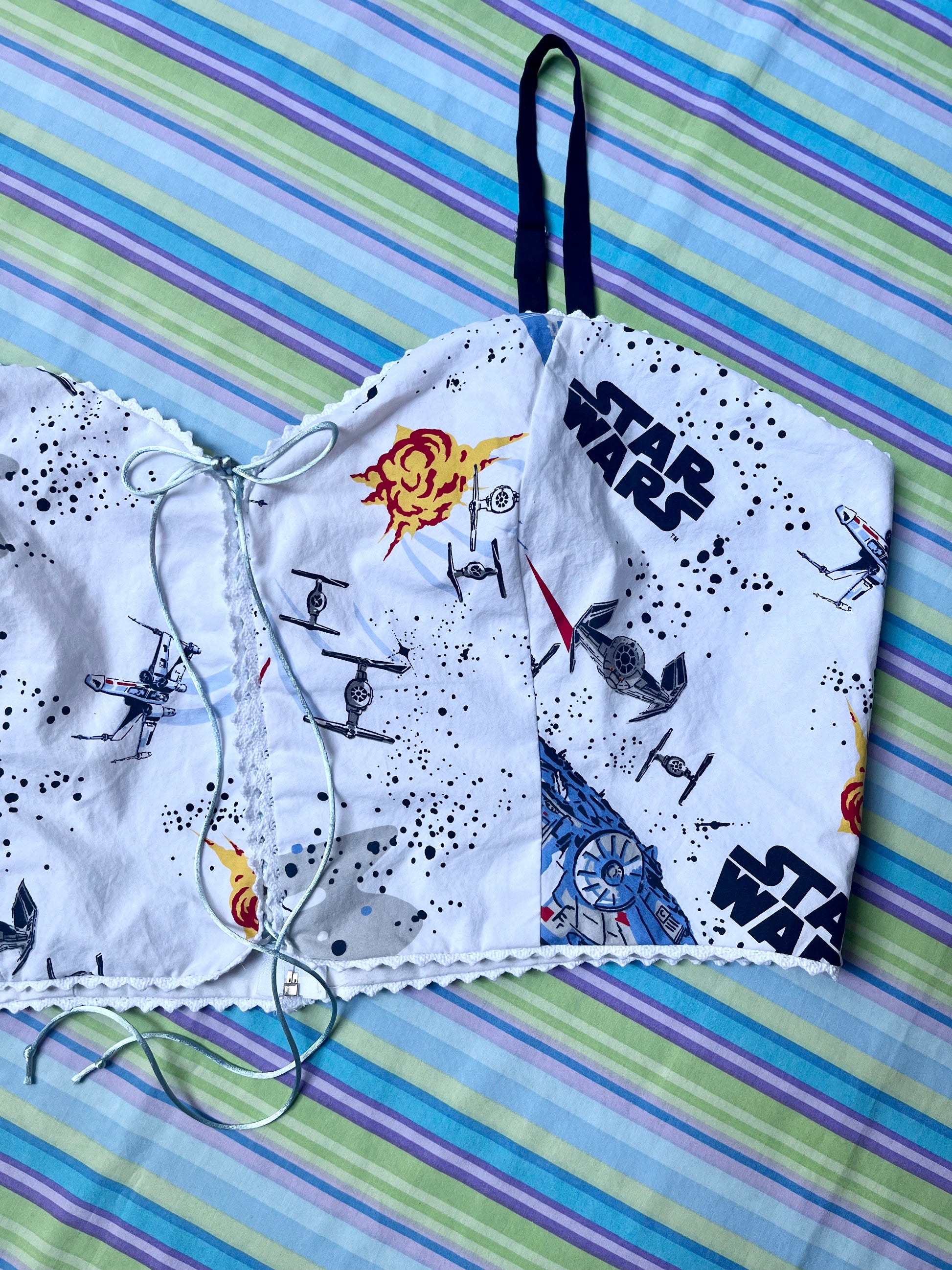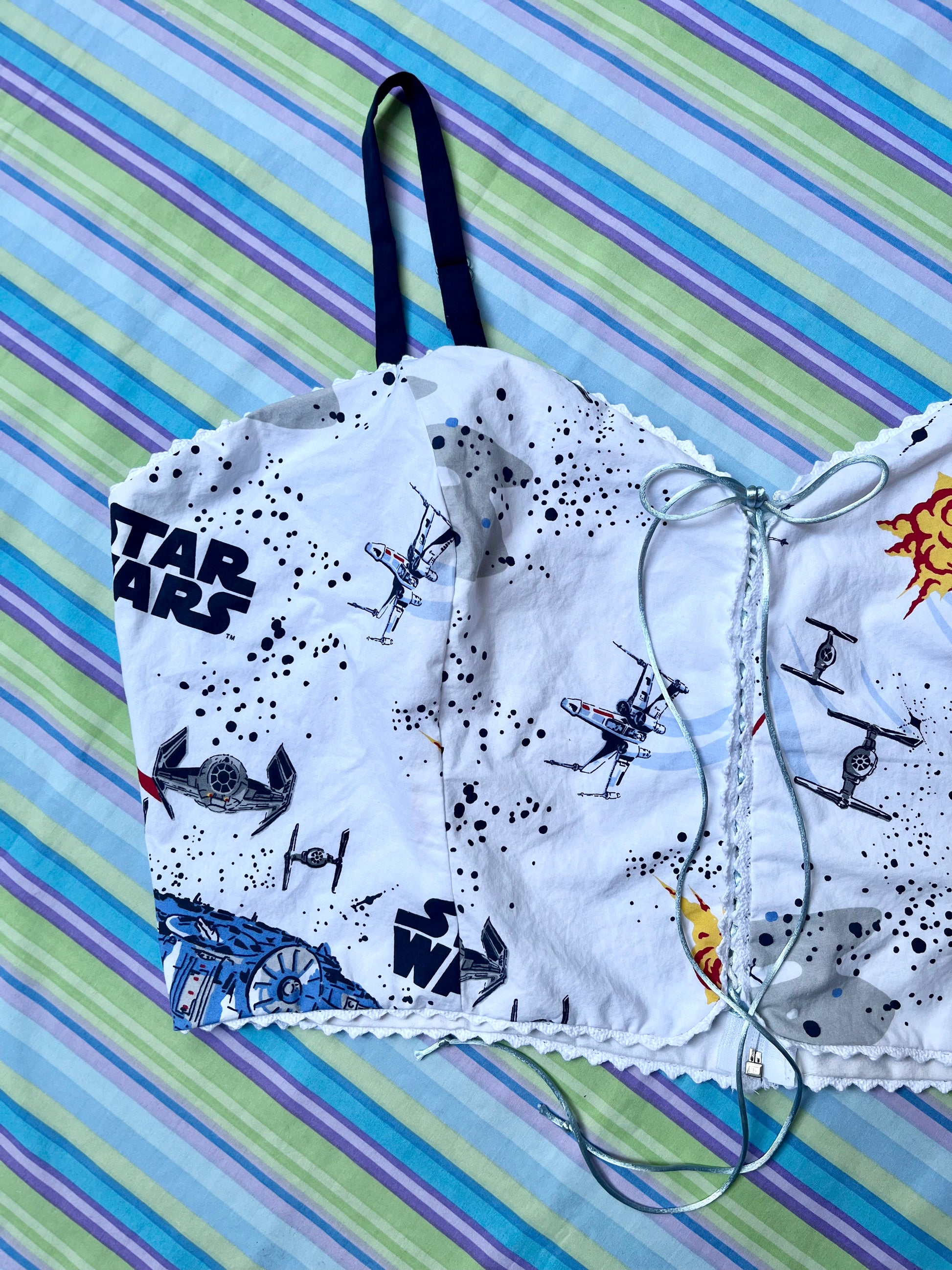 Using primarily bed linens, curtains, scrub tops, and other miscellaneous secondhand fabrics, we have made these corset tops as apart of our Nostalgia collection.
