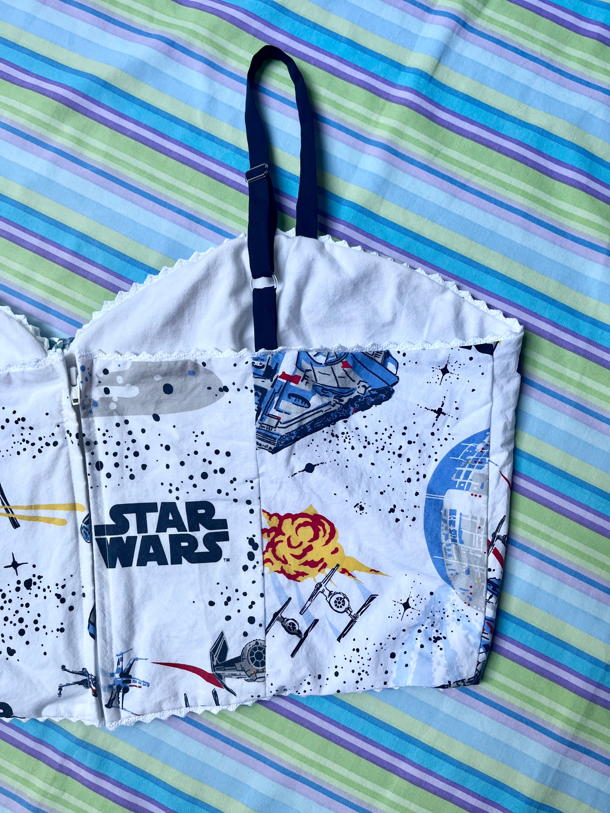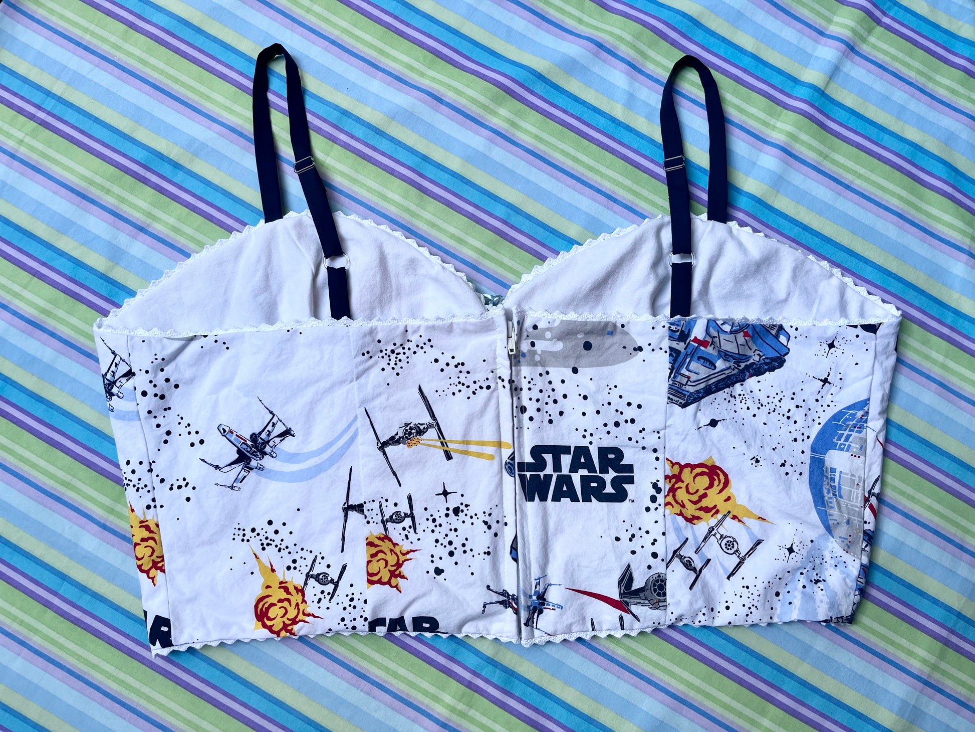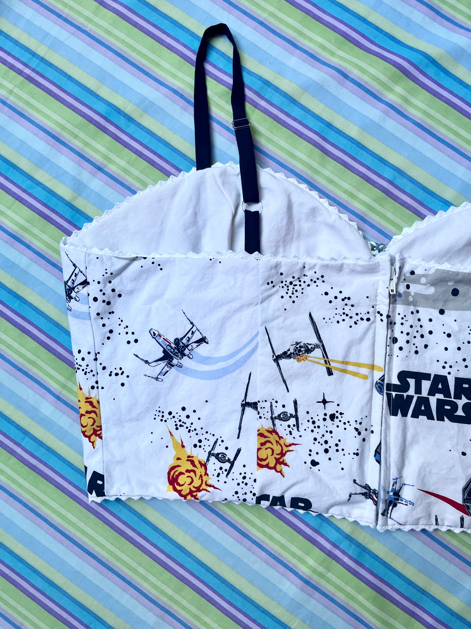 Using primarily bed linens, curtains, scrub tops, and other miscellaneous secondhand fabrics, we have made these corset tops as apart of our Nostalgia collection.