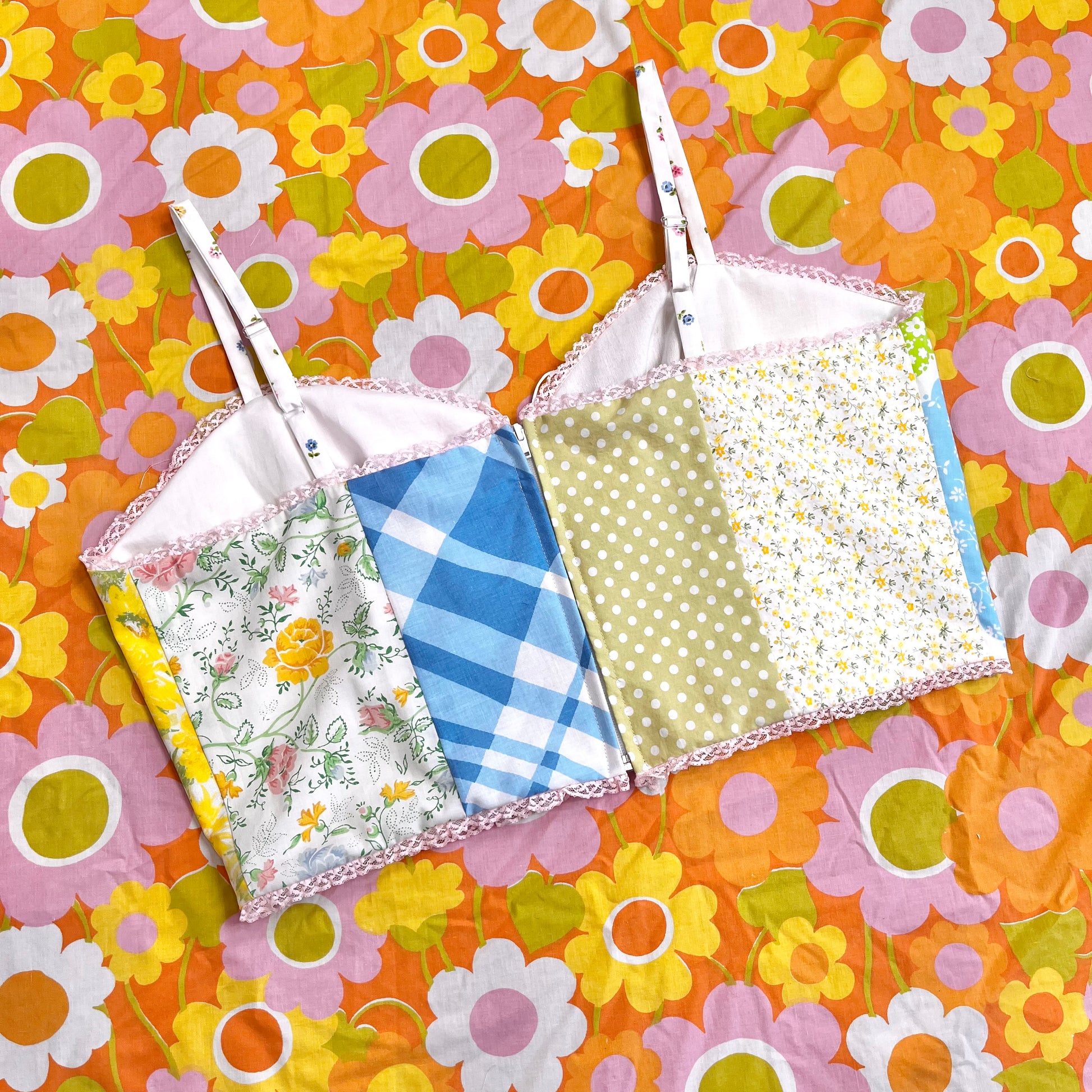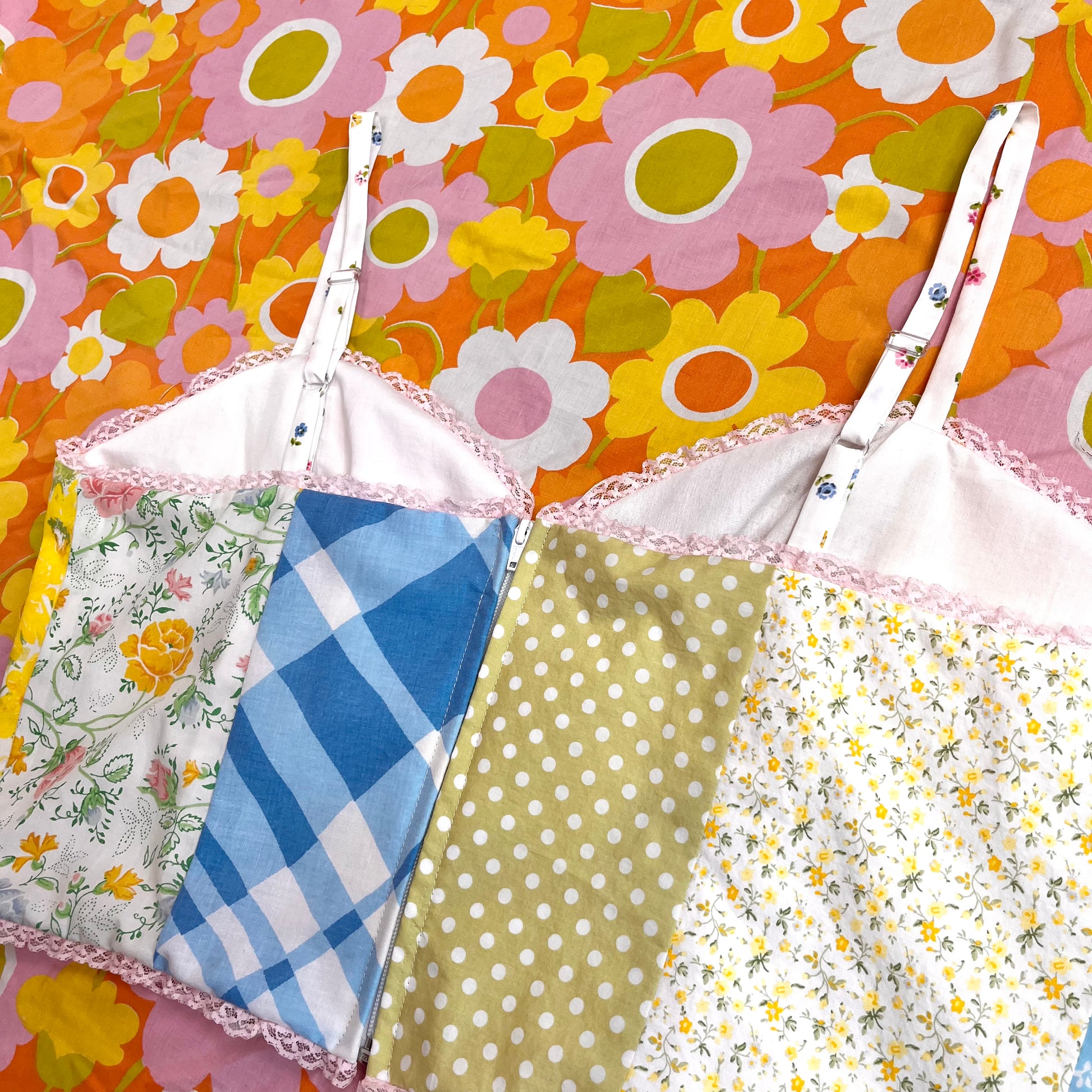 Exact fiber content of garment is unknown: We use primarily 100% cotton and cotton-poly blends, but as these are made from secondhand materials, the exact source/nature of the textiles cannot be confirmed. The bodice is lined with white cotton or a cotton-poly blend (we always aim for 60% cotton or more). The majority of our fabrics for this collection are from the 1960's and 1970's.