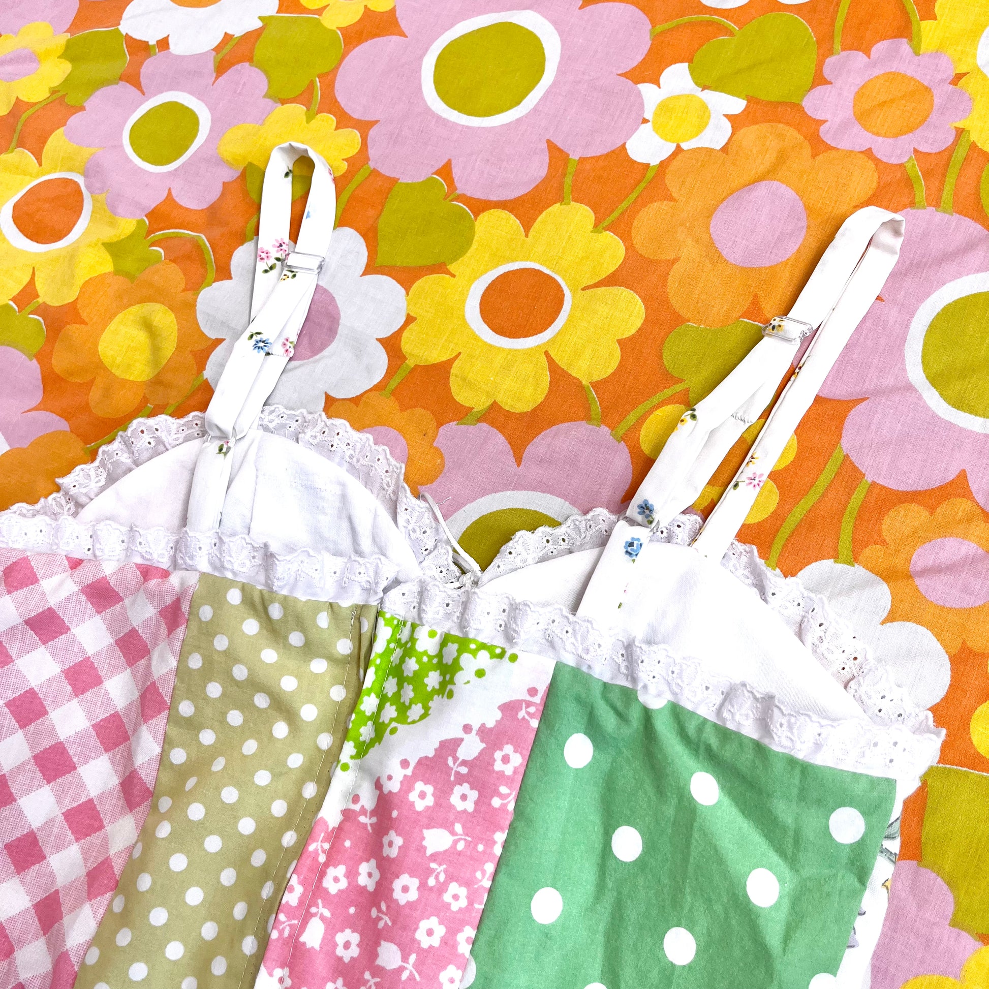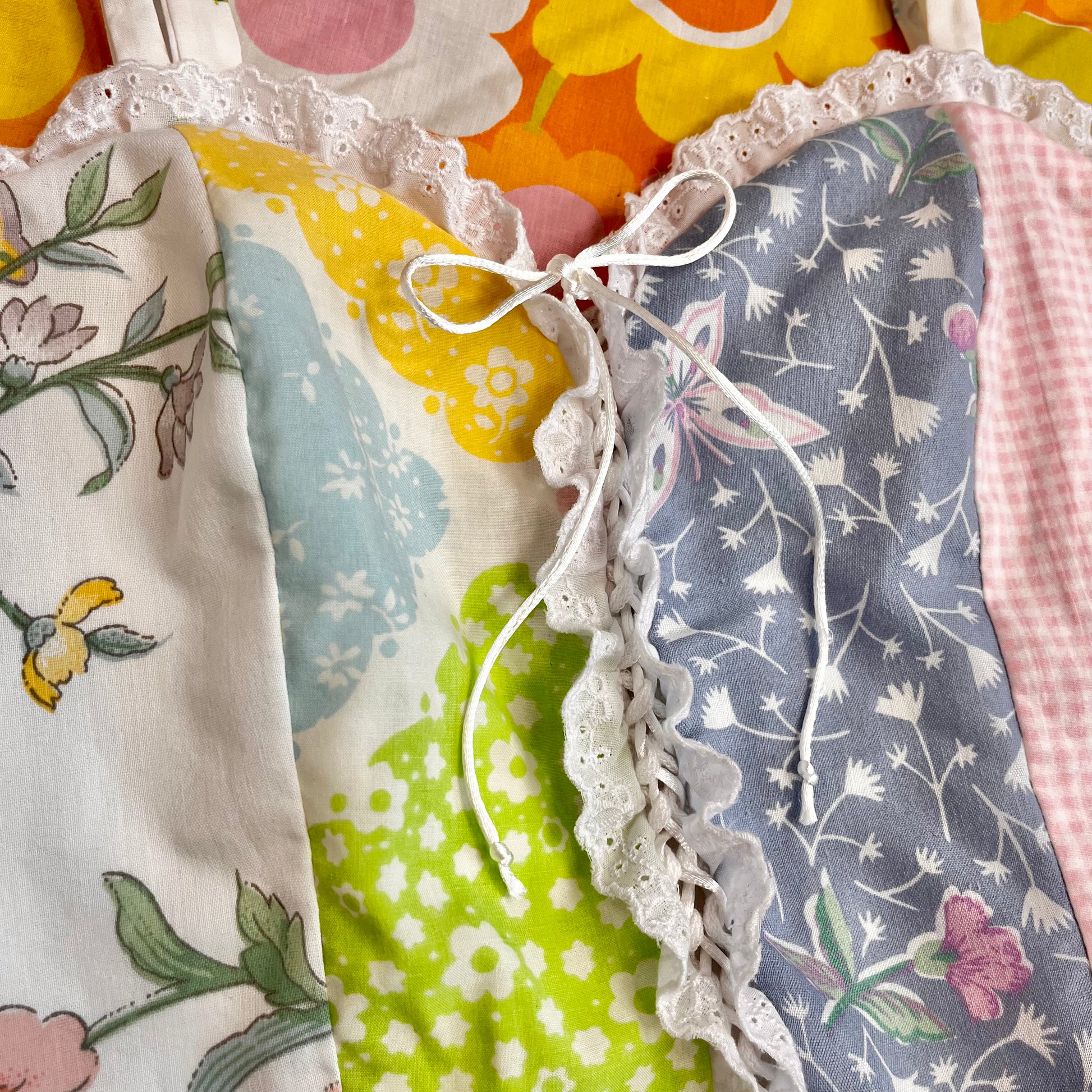 Exact fiber content of garment is unknown: We use primarily 100% cotton and cotton-poly blends, but as these are made from secondhand materials, the exact source/nature of the textiles cannot be confirmed. The bodice is lined with white cotton or a cotton-poly blend (we always aim for 60% cotton or more). The majority of our fabrics for this collection are from the 1960's and 1970's.