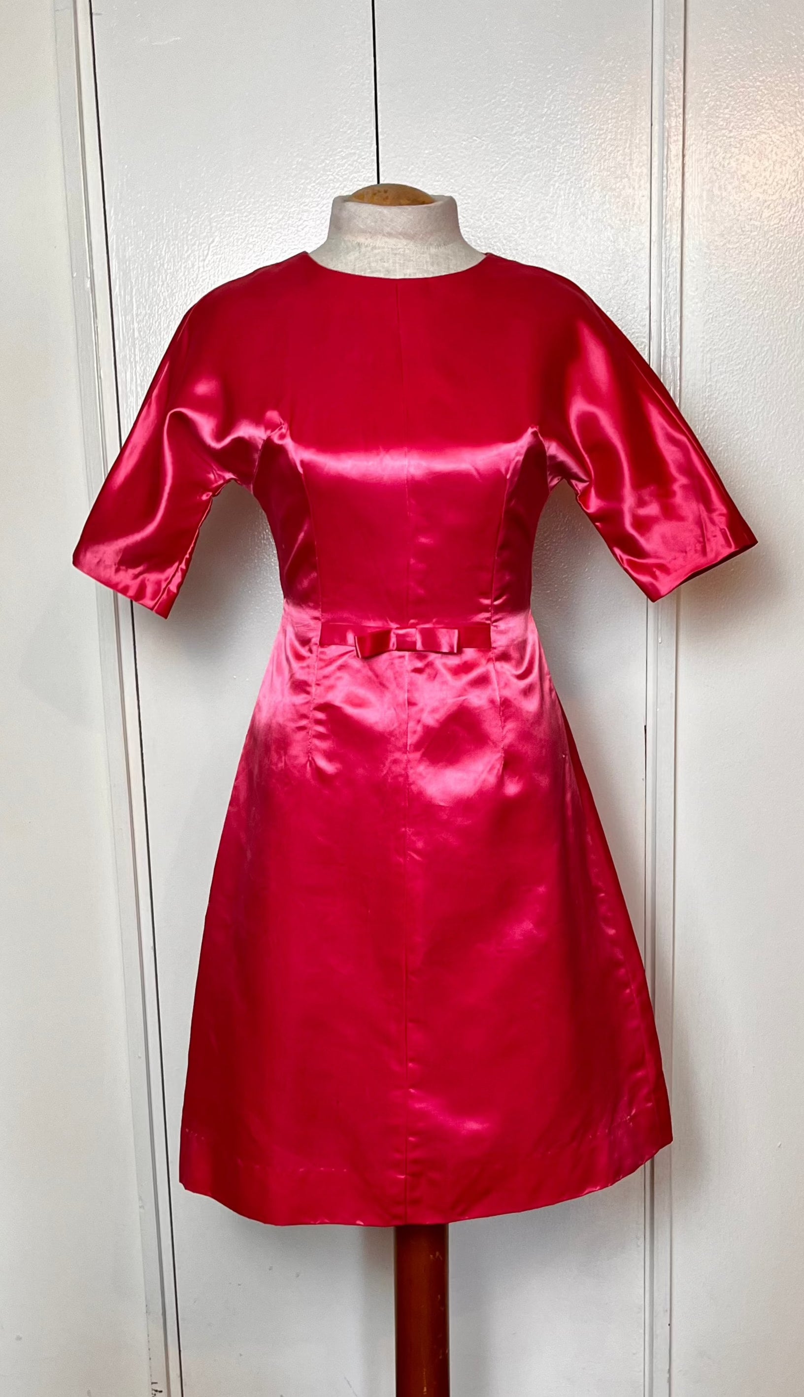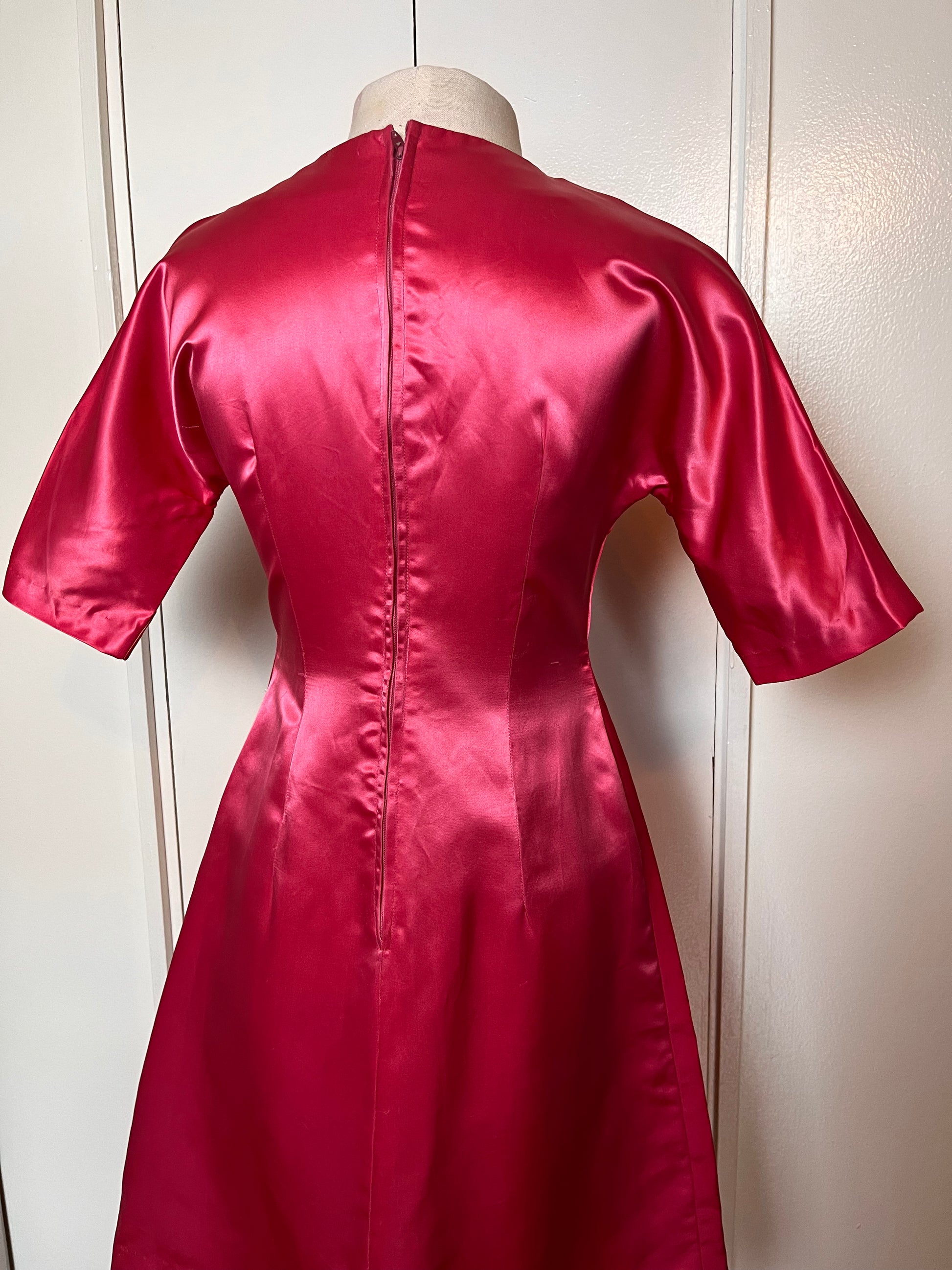 Vintage 1950’s Shocking Hot Pink Satin Three-Quarter Sleeve Sheath Dress
