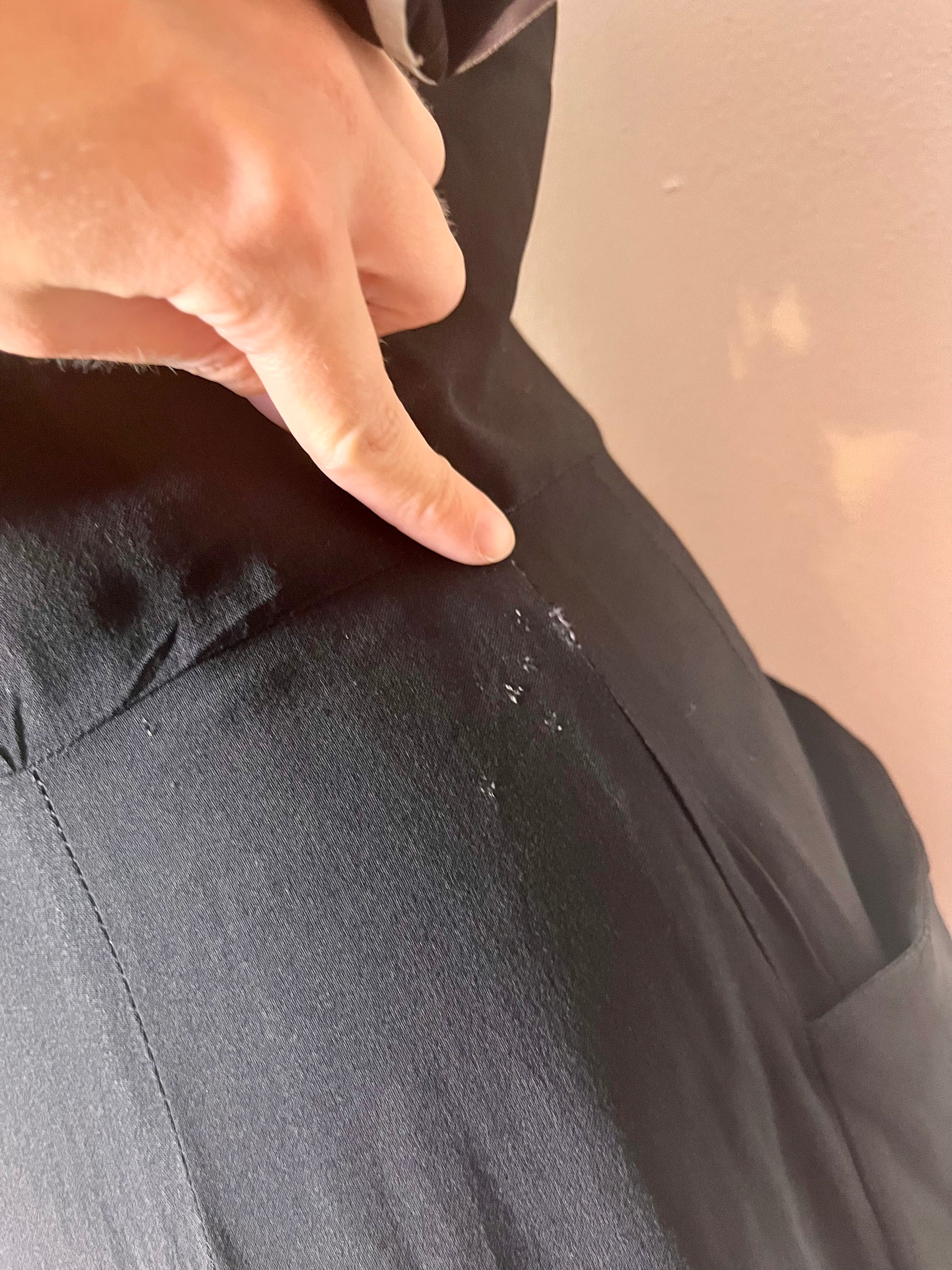 Good condition. A minor amount of wear at one of the side seams along the hip.