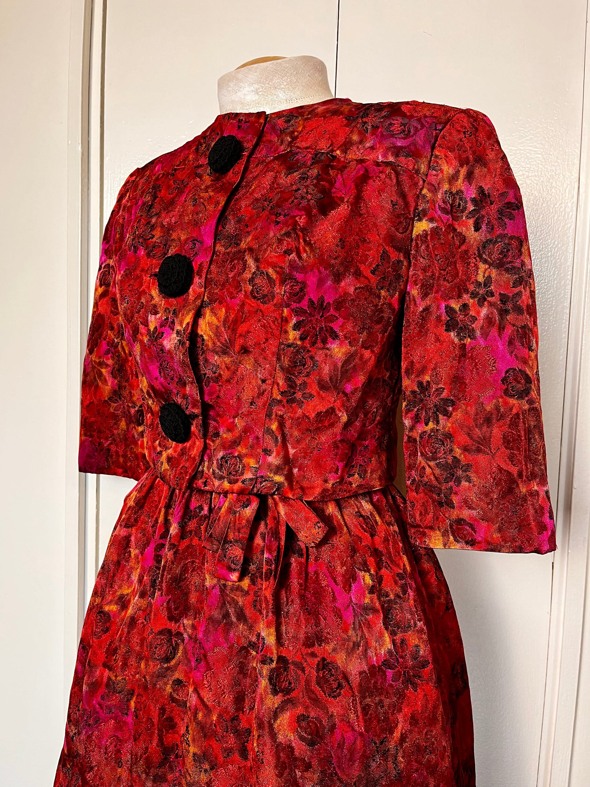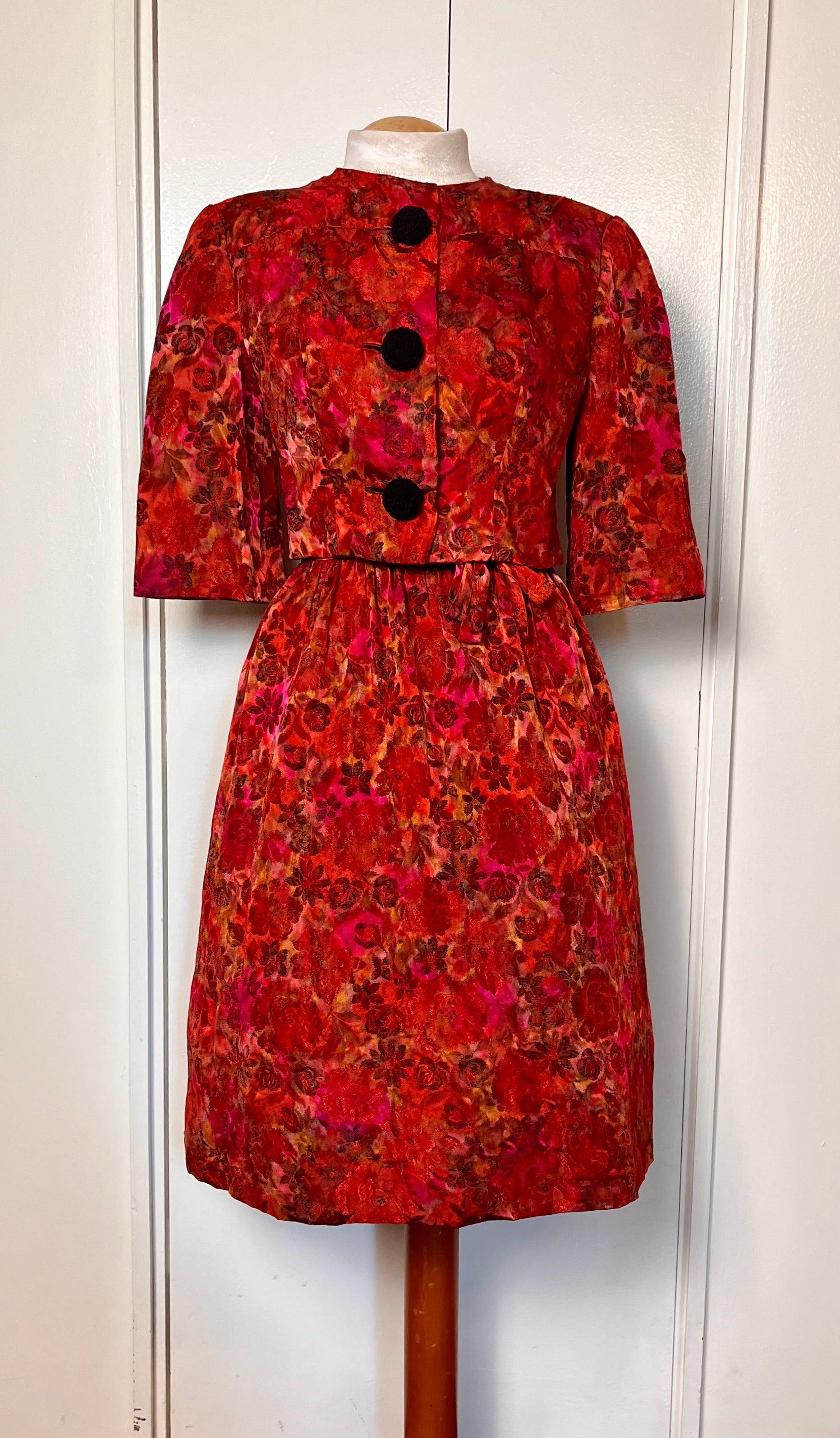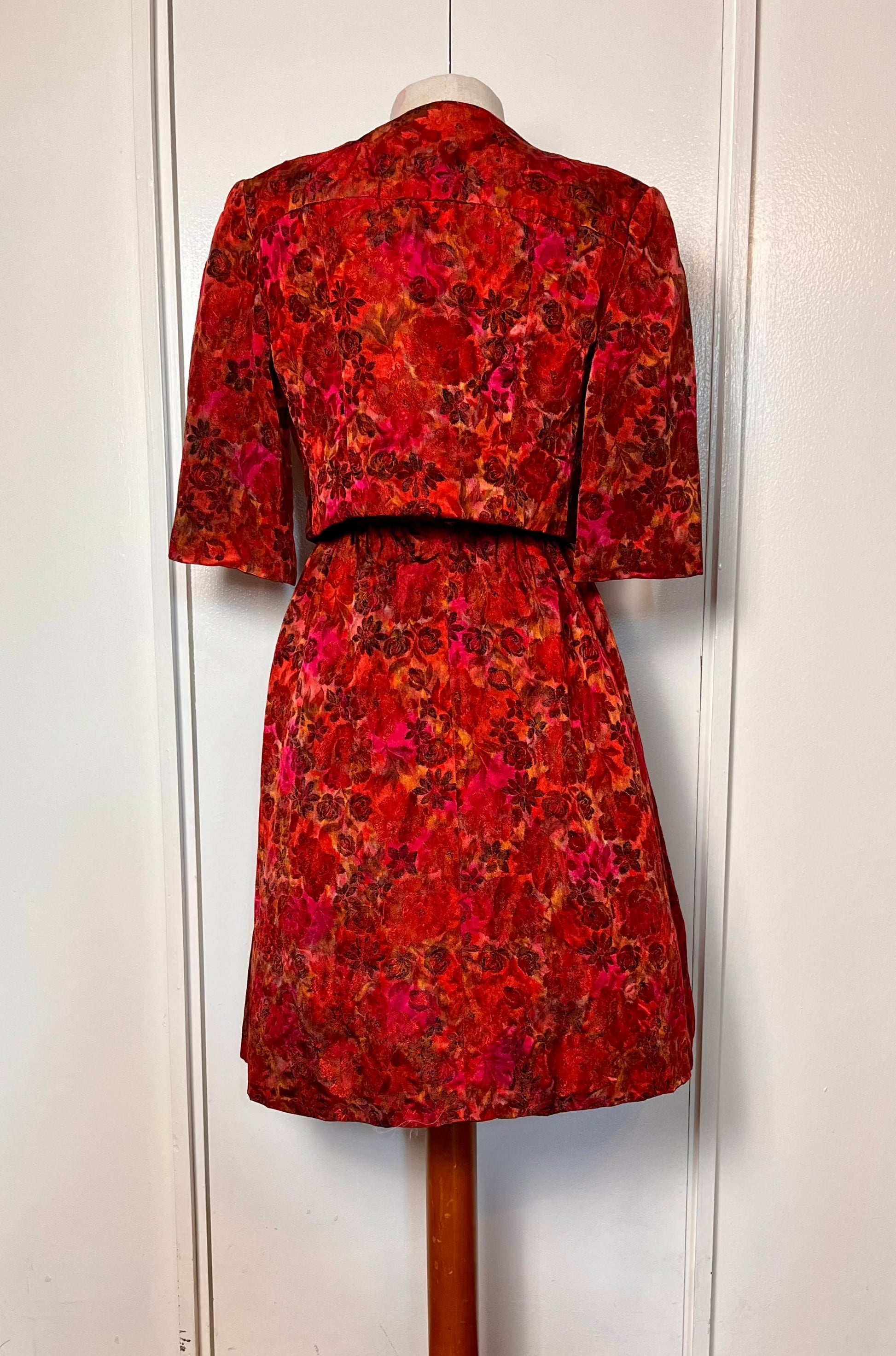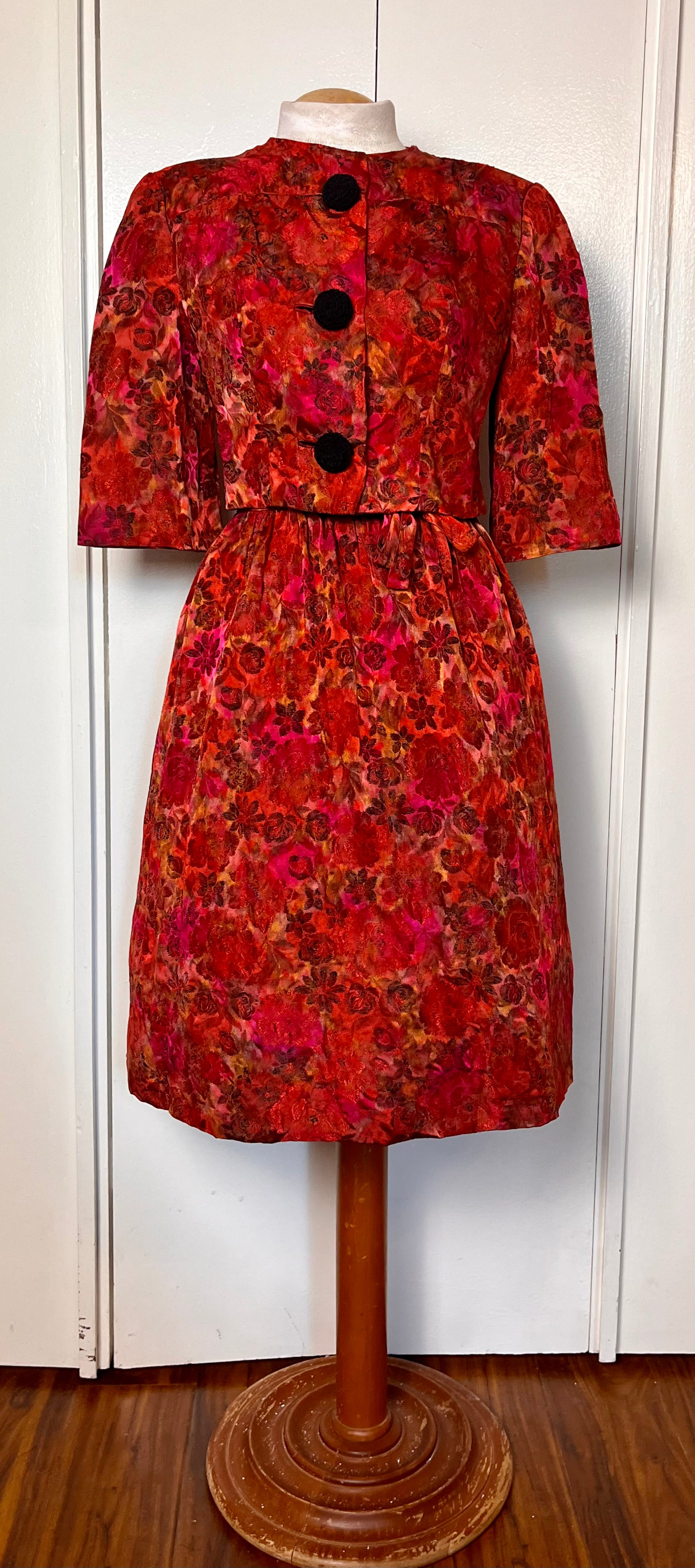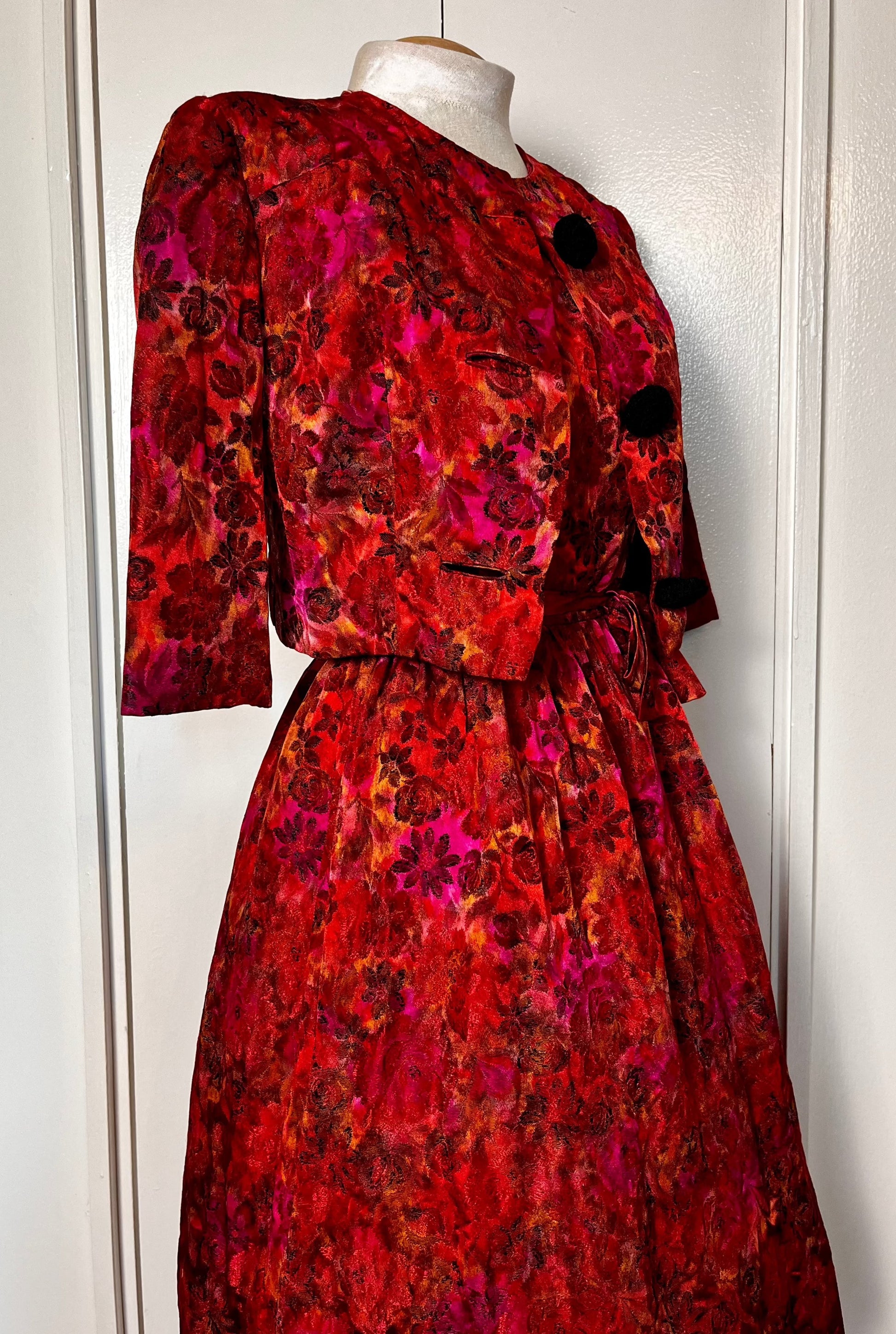 Vintage 1950's Rare Designer "Gustave Tassell" Two-Piece Set Matching Dress & Jacket in Pink, Red, & Orange Silk-Brocade Floral