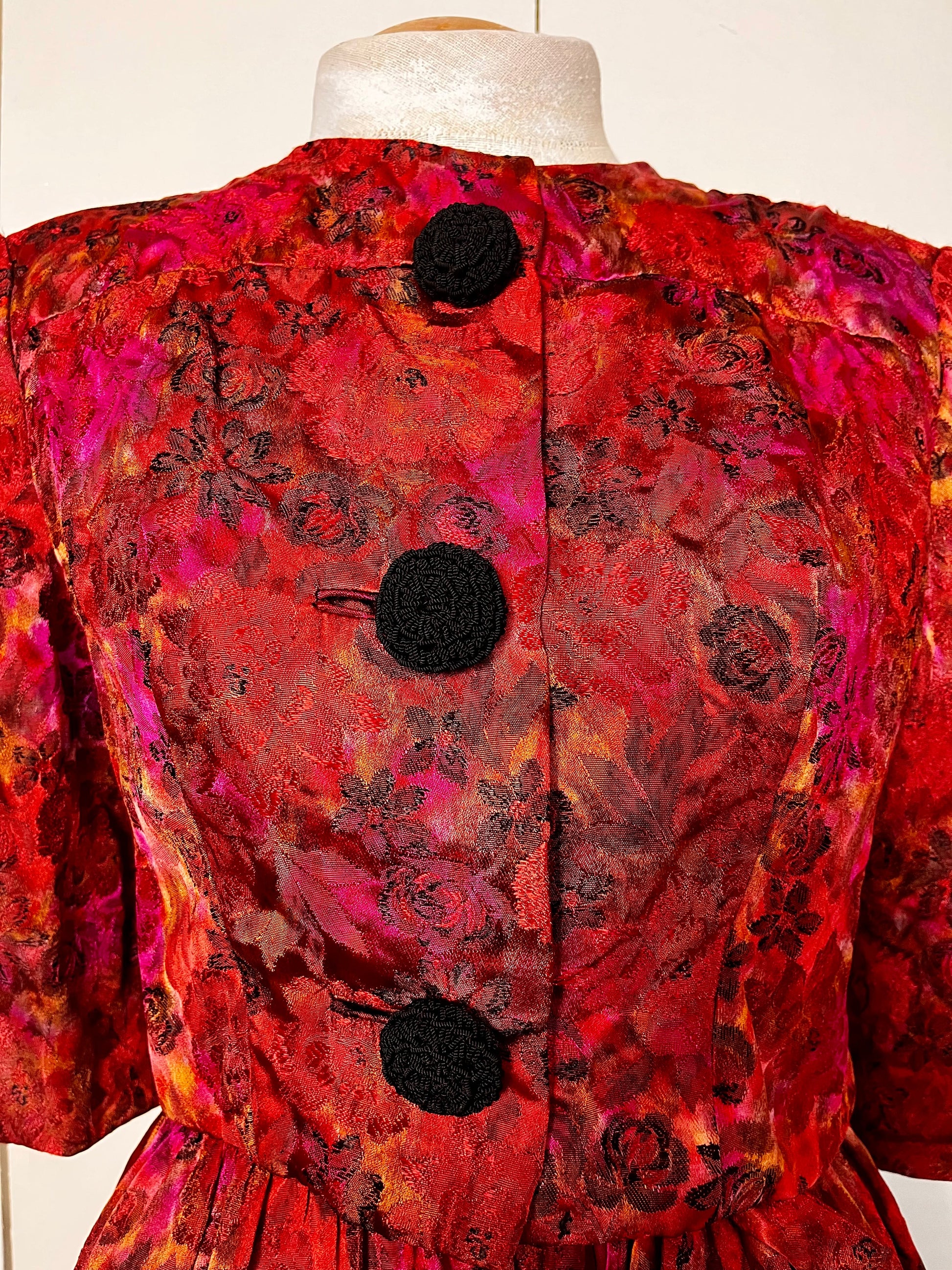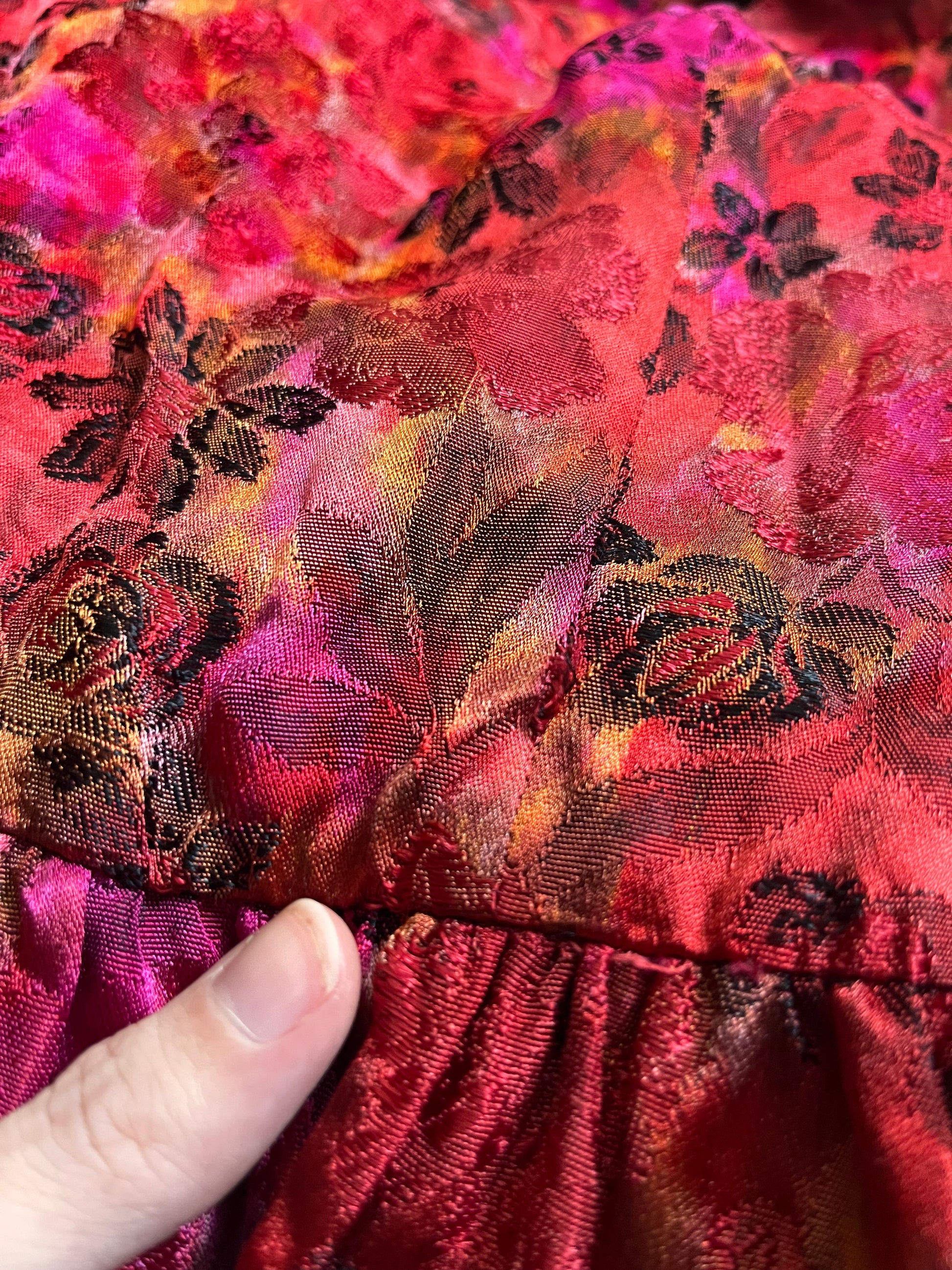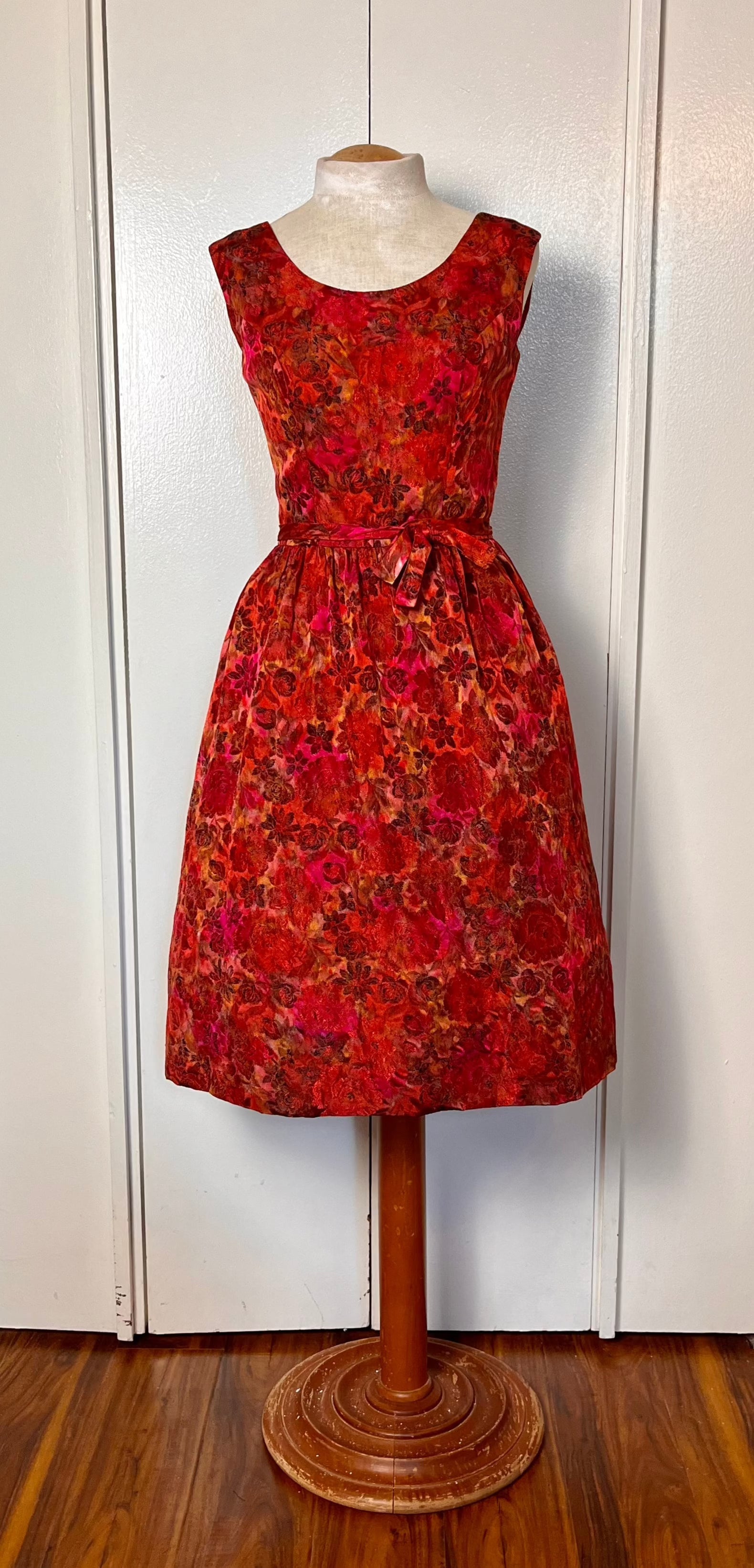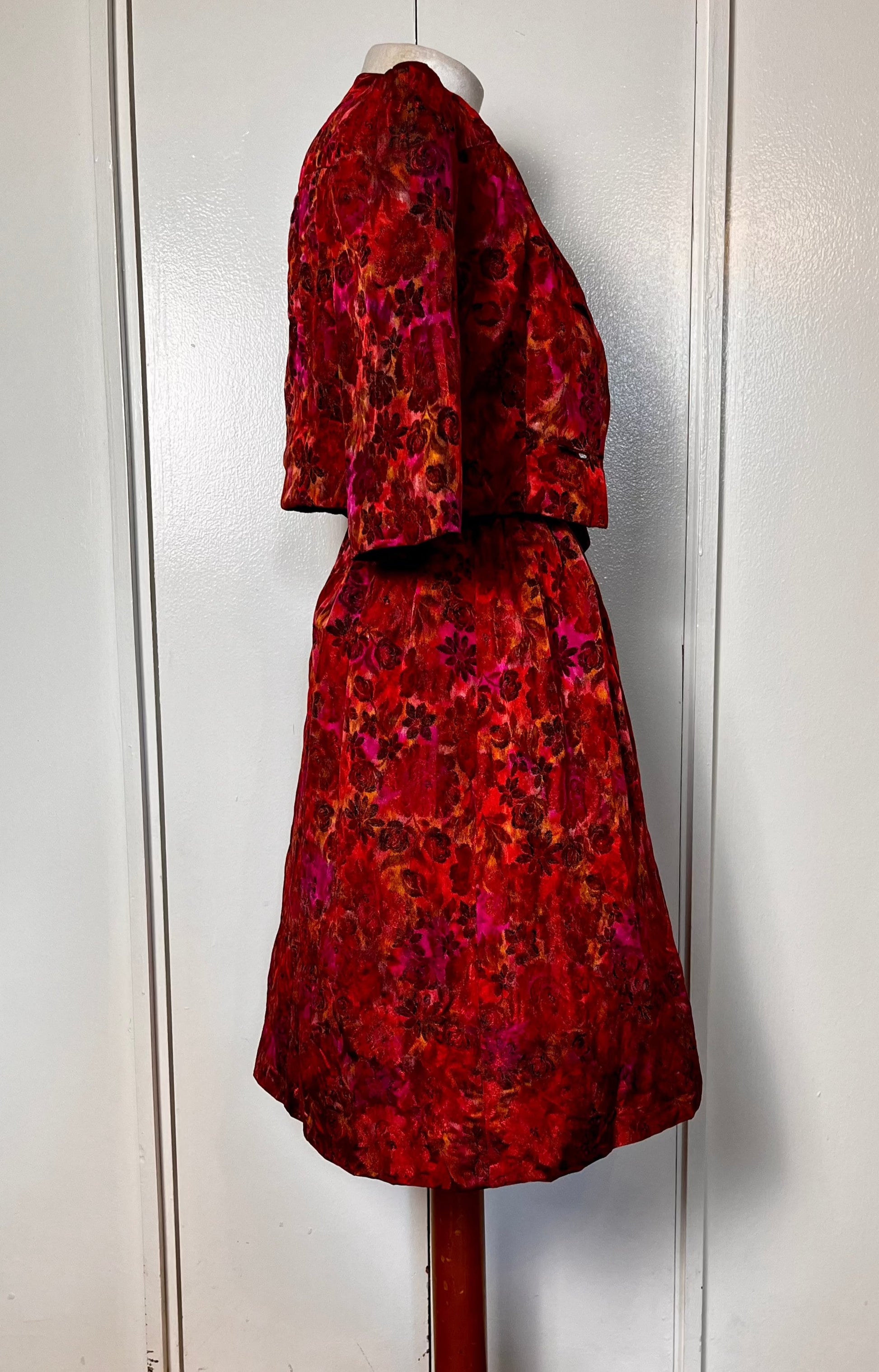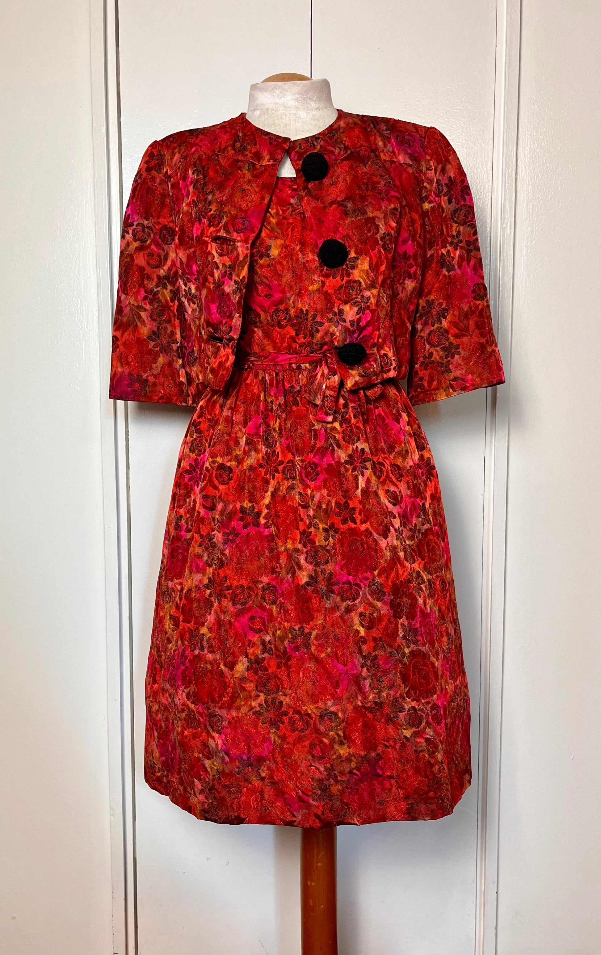 Vintage 1950's Rare Designer "Gustave Tassell" Two-Piece Set Matching Dress & Jacket in Pink, Red, & Orange Silk-Brocade Floral