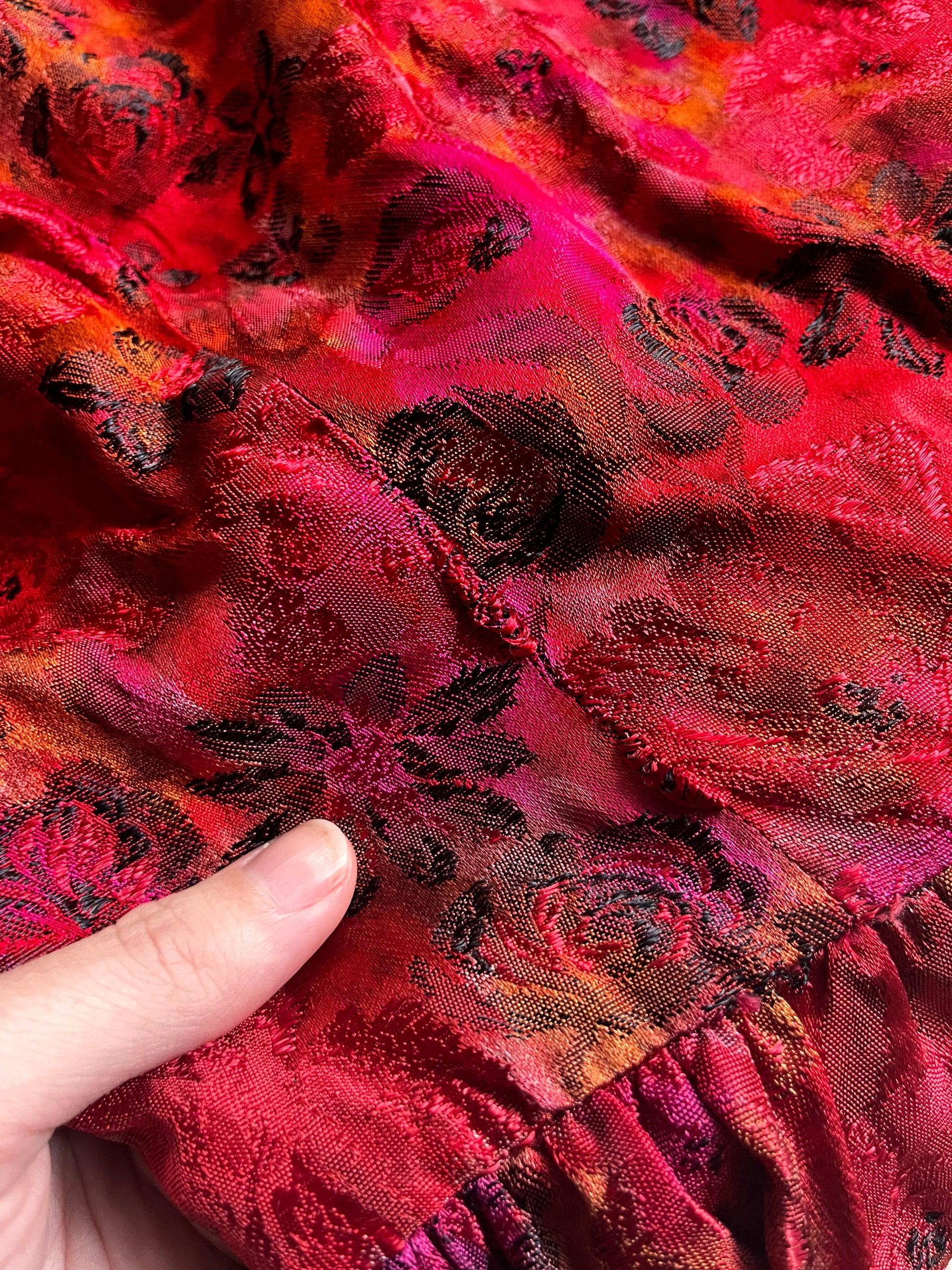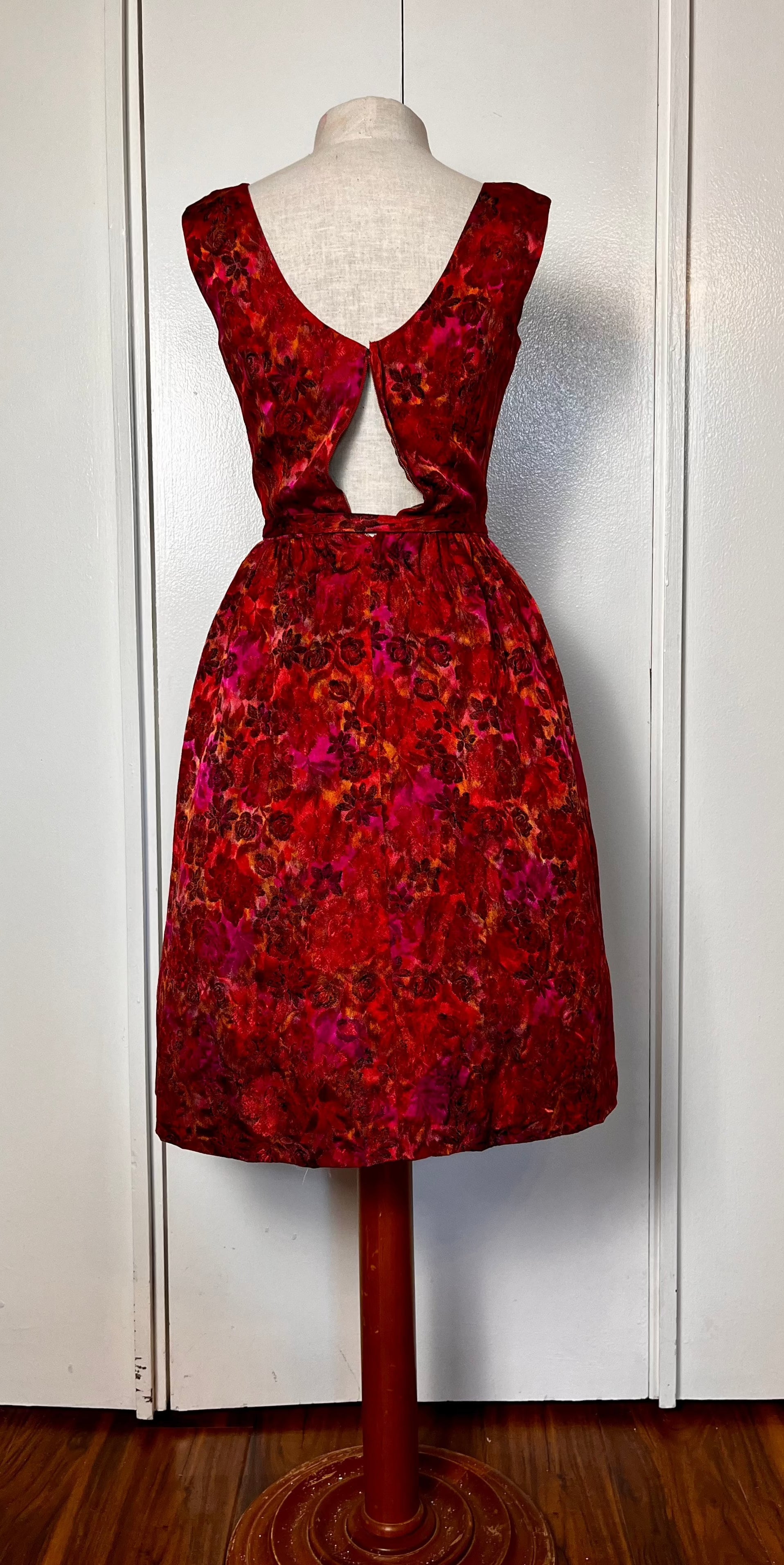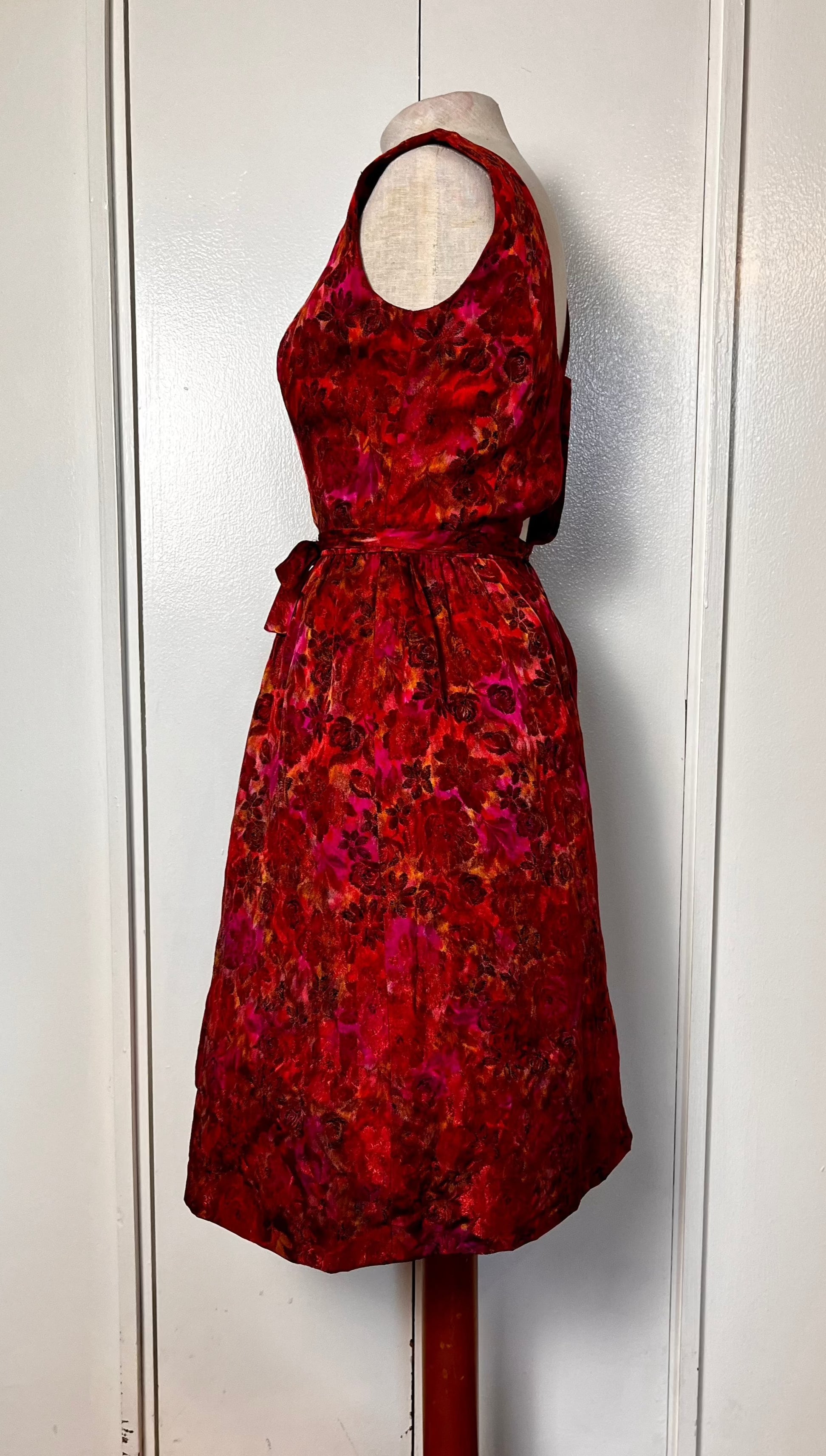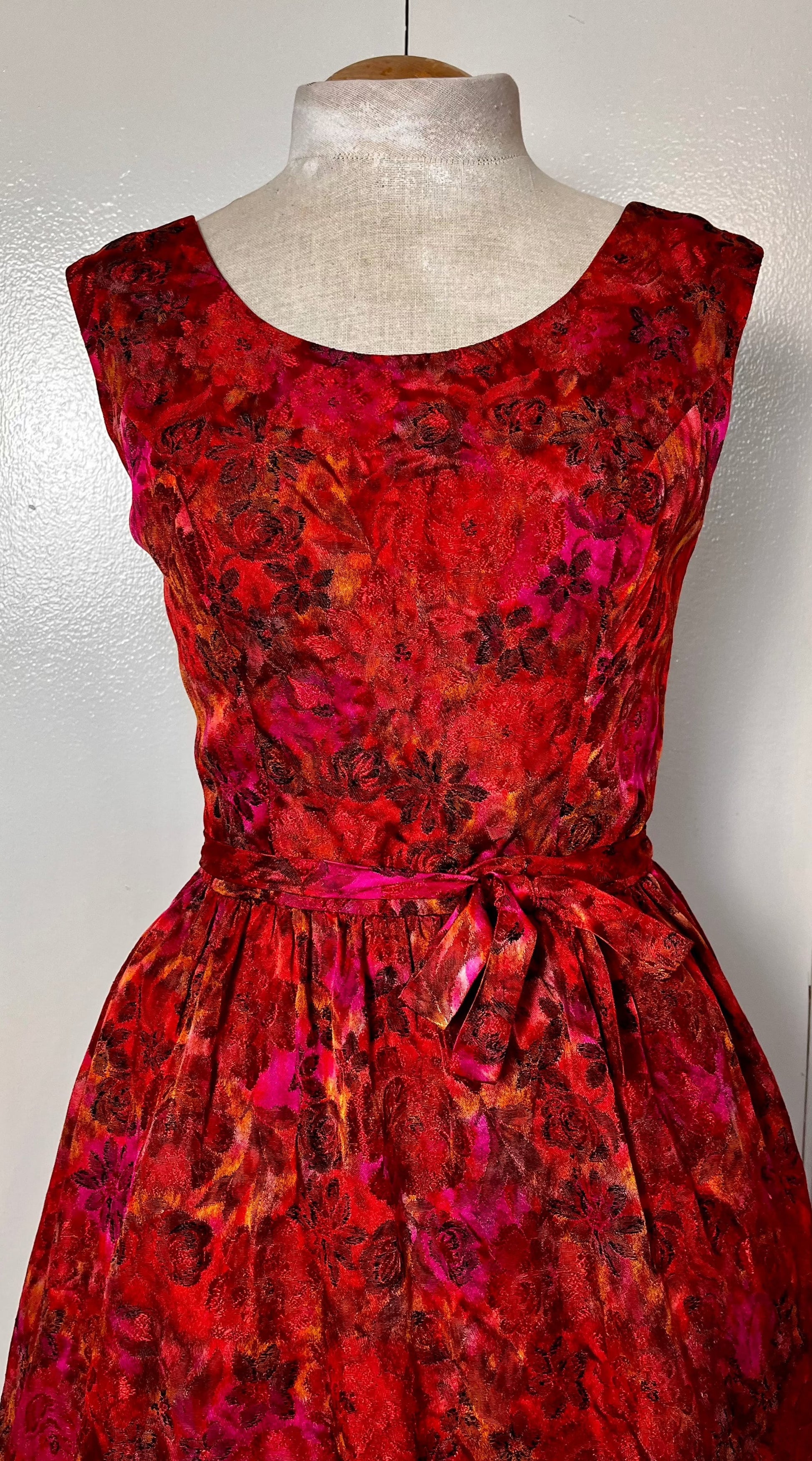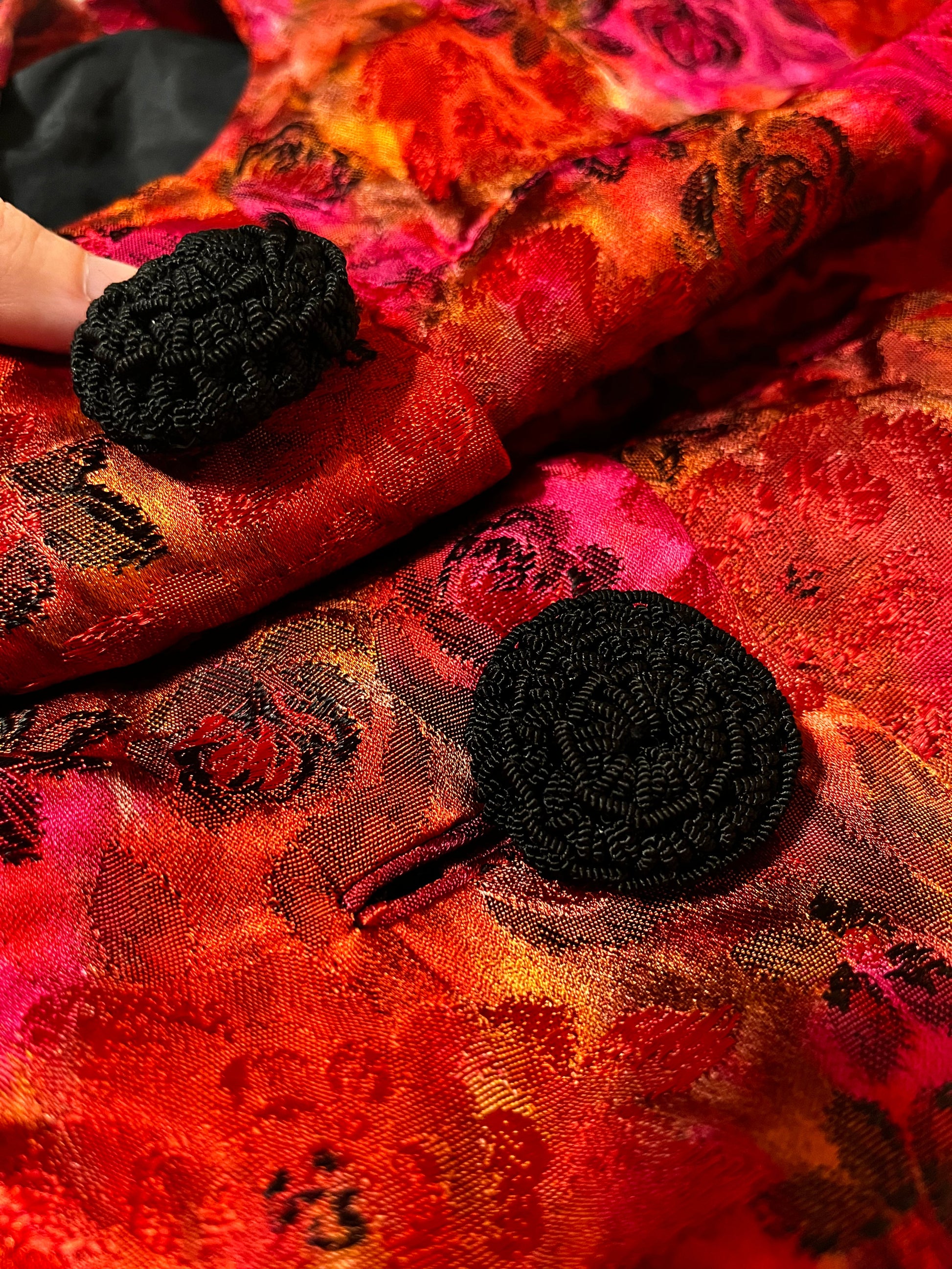 Vintage 1950's Rare Designer "Gustave Tassell" Two-Piece Set Matching Dress & Jacket in Pink, Red, & Orange Silk-Brocade Floral